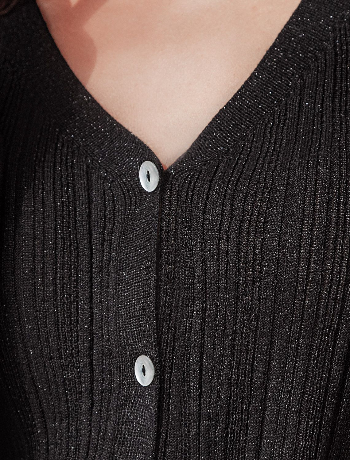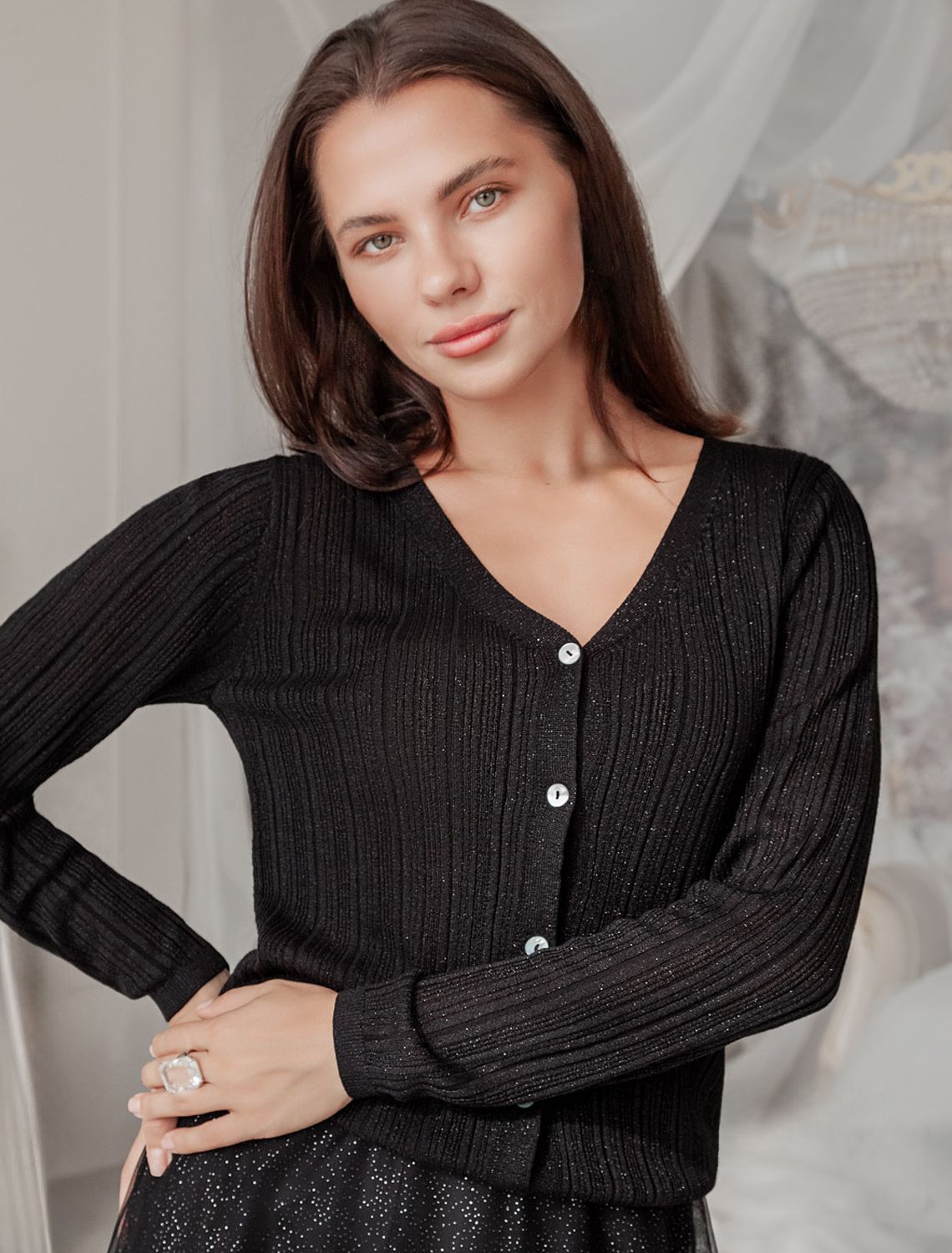 Жакет выполнен из вискозы тонкой вязки с мягким люрексом. Нежная пряжа очень приятная к коже, совсем не колется, поэтому изделие можно носить как первый слой на голое тело или с топом, как дополнение к образу. Комфортная длина выреза подходит для любой фигуры. Пуговицы из натурального перламутра подчеркивают изящный блеск изделия.
