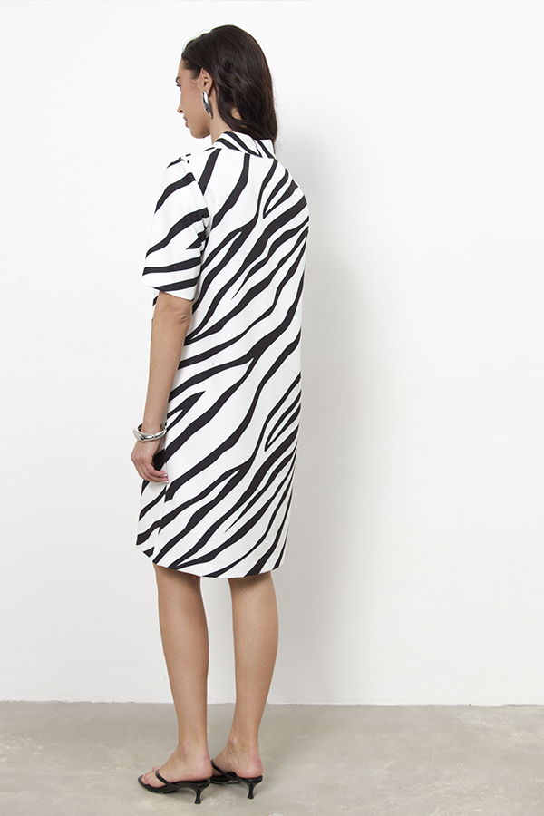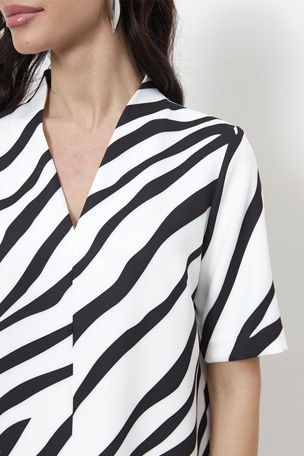 Платье свободного силуэта из плательной ткани. По центру передней части изделия выполнен шов. Цельнокроеная стойка, переходящая в V-образный вырез горловины, визуально делает фигуру стройнее. Втачной короткий рукав.