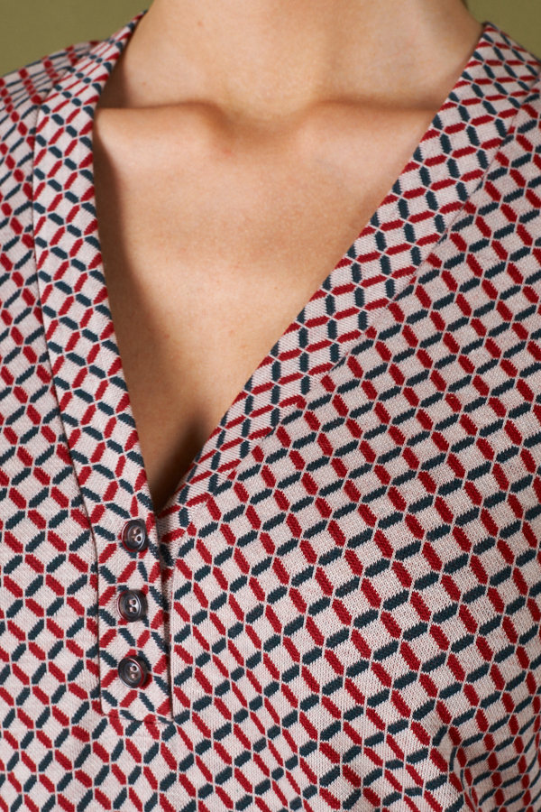 Платье полуприлегающего силуэта из эластичного полотна с жаккардовым узором. Втачной длинный рукав. V-образный вырез горловины, оформлен бейкой и украшен пуговицами.