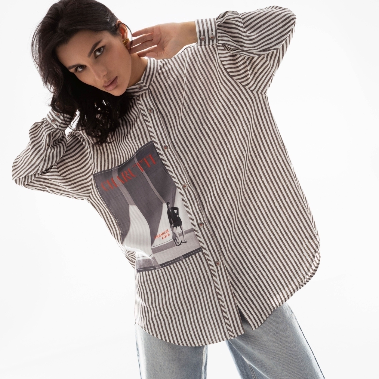 Невесомая ткань «бабл-сатин», необработанные края и элементы декора из шелка Armani. Рубашка – гордость премиальной коллекции CHARUTTI. Изготовлена в ограниченном количестве, практически нет шансов встретить такую же.