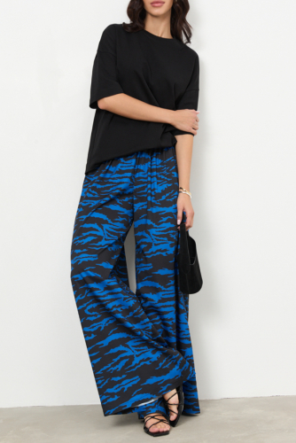Брюки прямого свободного силуэта из вискозной ткани. Пояс притачной с эластичной резиной, в боковых швах карманы.