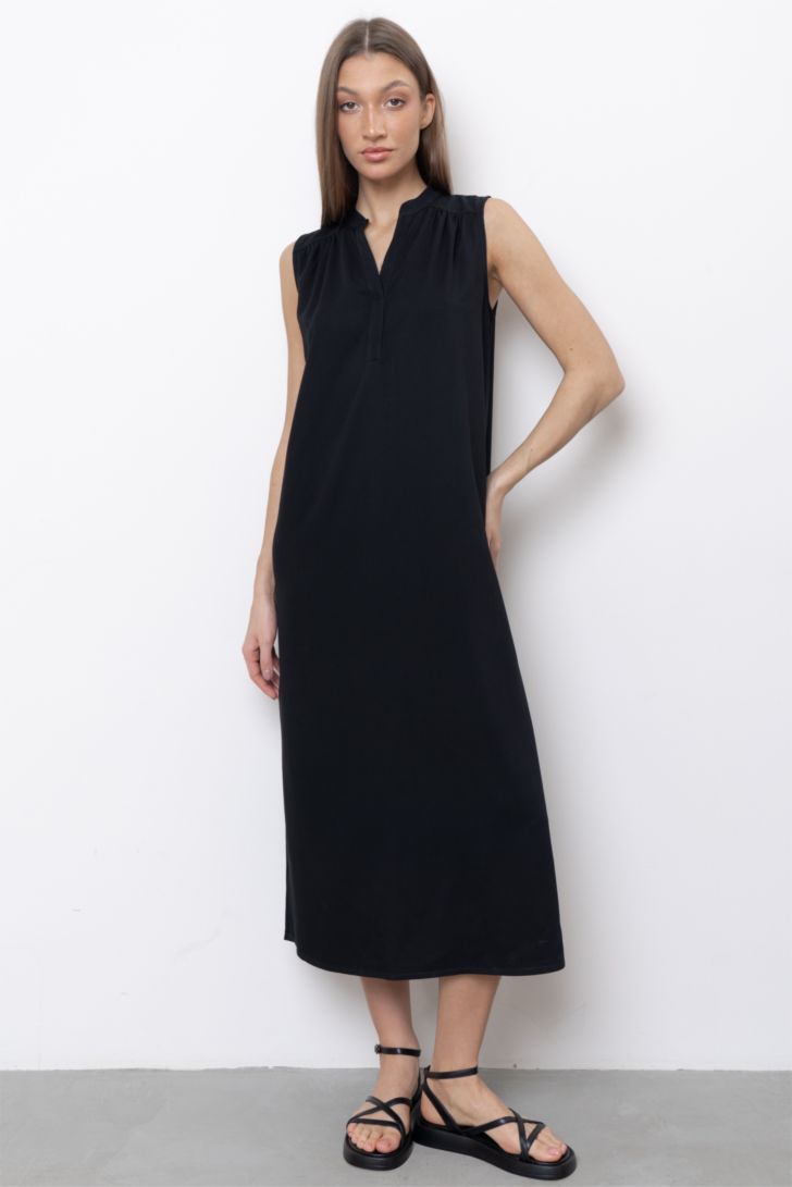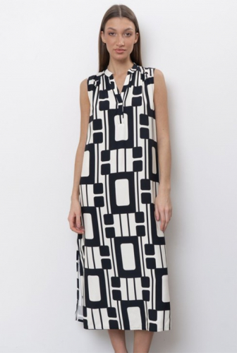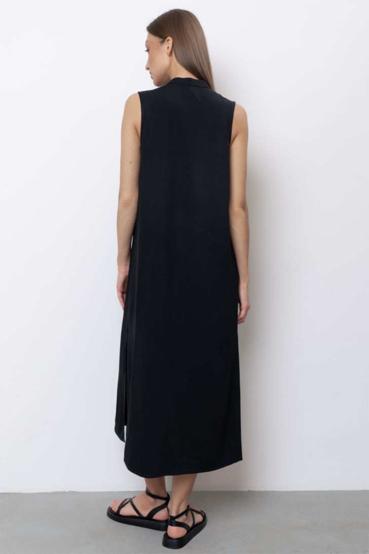 Прямое платье свободного силуэта без рукавов с высокими разрезами по бокам. Горловина и вырез обработан планкой из основного полотна. Данная модель универсальна. Вы всегда можете создать гармоничный и стильный образ, соединив его с брюками 5314W-50075.4F. Модель представлена в двух цветовых решениях.