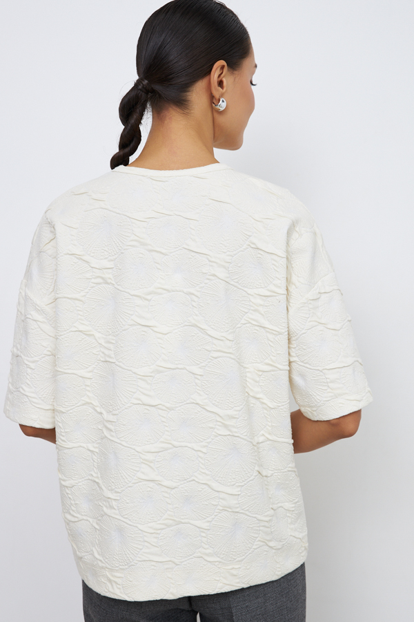 Джемпер свободного силуэта со спущенной линией плеча и рукавом до локтя выполнен из фактурного эластичного полотна. Вырез горловины окантован эластичной бейкой. В таблице размеров представлены параметры человека, а не изделия.