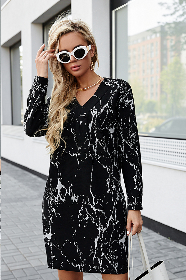 Платье свободного силуэта из фактурного эластичного полотна. V-образный вырез горловины обработан притачной планкой. Втачной длинный рукав в спущенную пройму с манжетой.