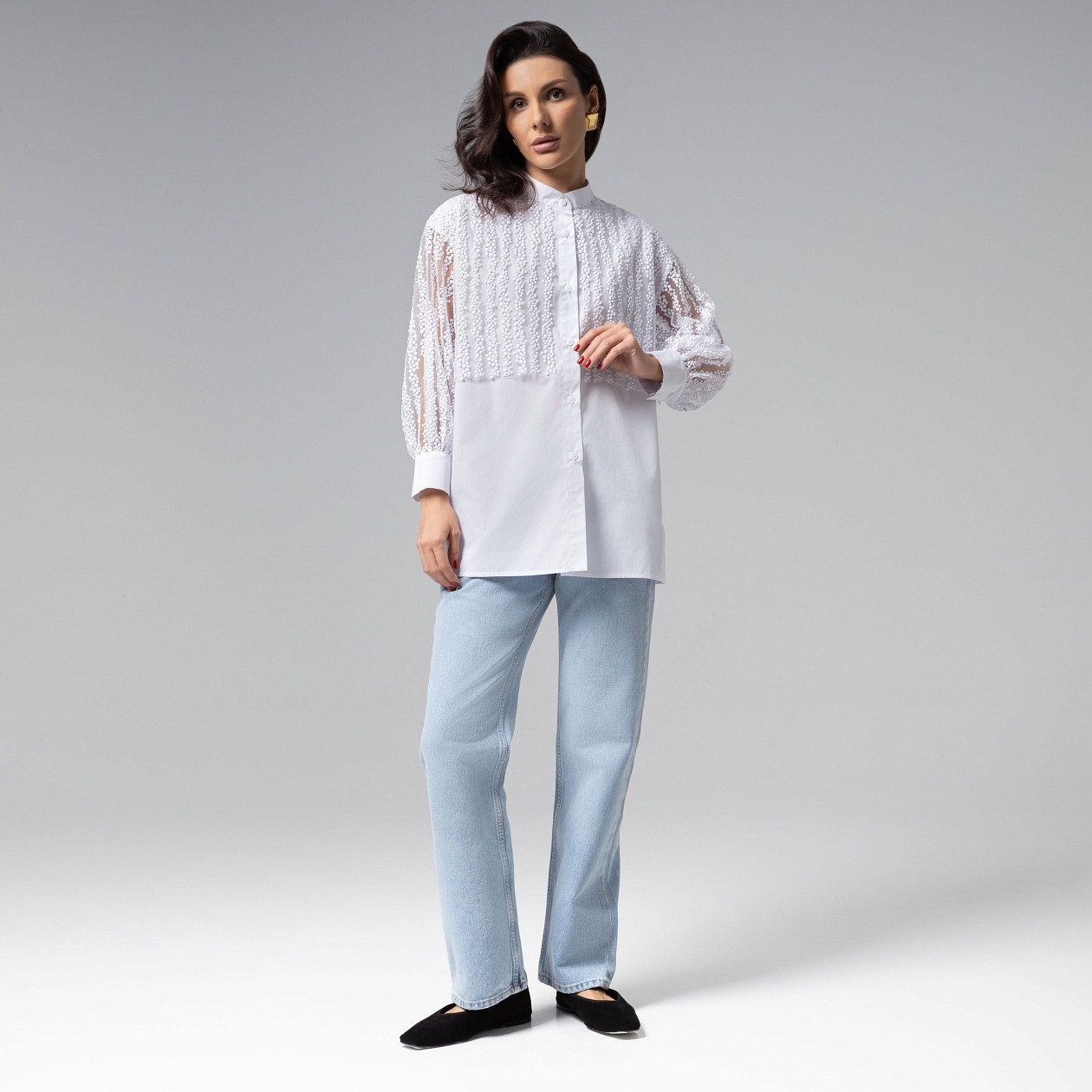 Свободный, но выверенный крой рубашки из коллекции PREMIUM заслуживает вашего внимания. Плотный хлопок создает элегантный силуэт, а декор из вышивки на сетке, ниспадающей с плеч, добавляет ноту изысканной роскоши, сохраняя при этом сдержанность линий. Такой образ будет уместен как в офисе, так и на светском приеме. Воплощение вечной элегантности, когда каждая деталь, от безупречных швов до деликатной вышивки, говорит о безусловном вкусе.