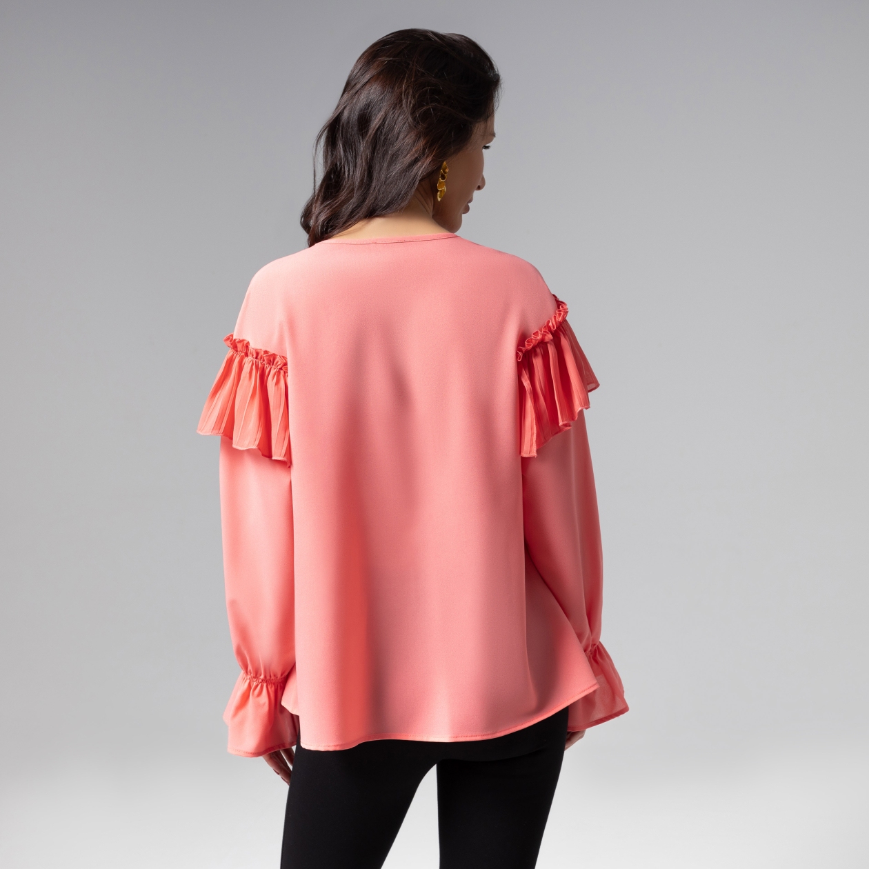 Коралловое сияние ЧАРУТТИ. Свободный крой блузы из роскошной ткани струится по фигуре, создавая эффект утонченной невесомости. Обилие воланов по передней части изделия и на рукавах, выполненны с виртуозной точностью. Безупречные швы и идеально обработанные края свидетельствуют о высочайшем уровне пошива. Блуза коллекции PREMIUM – воплощение изысканной женственности, где роскошь кроя встречается с бескомпромиссным качеством исполнения.