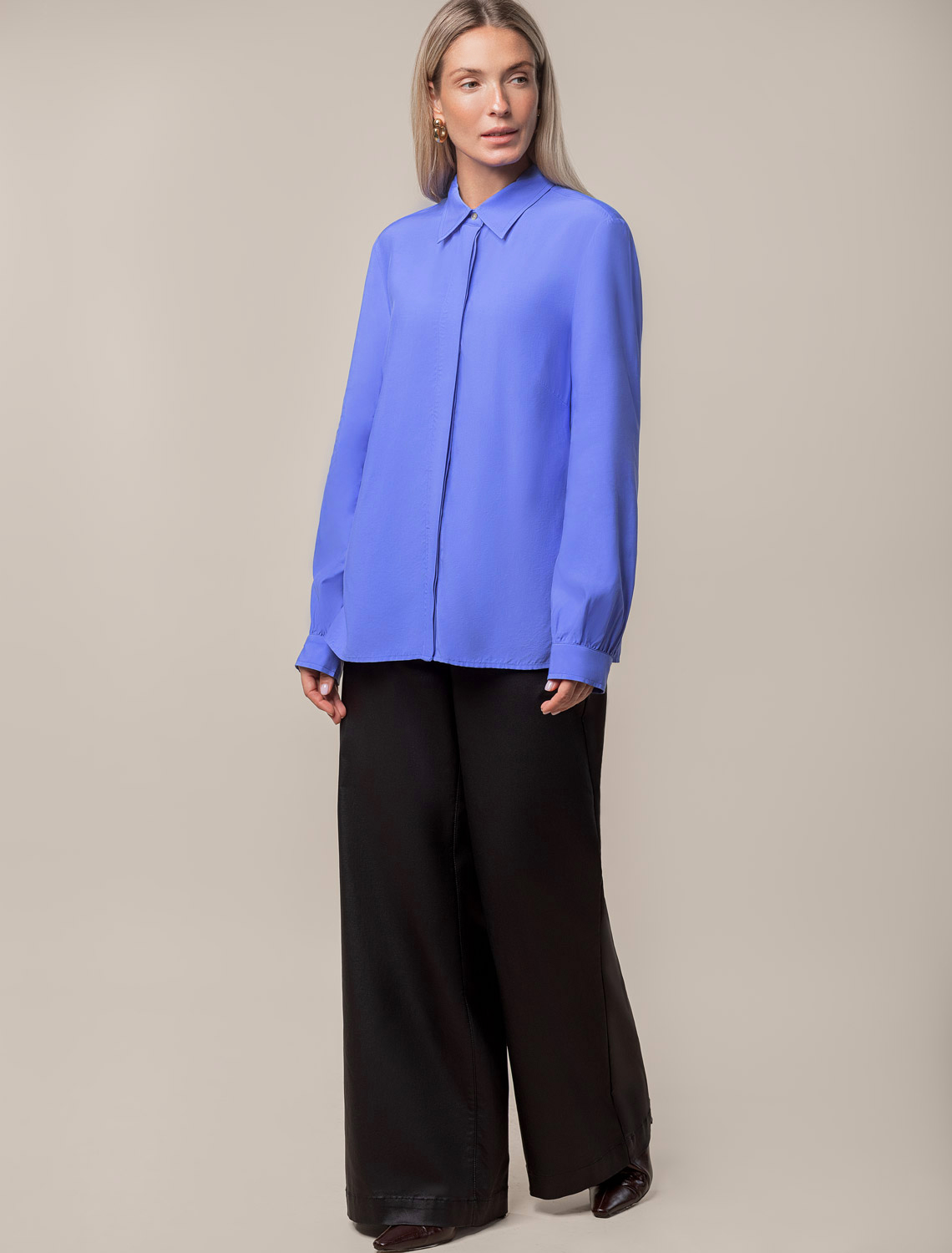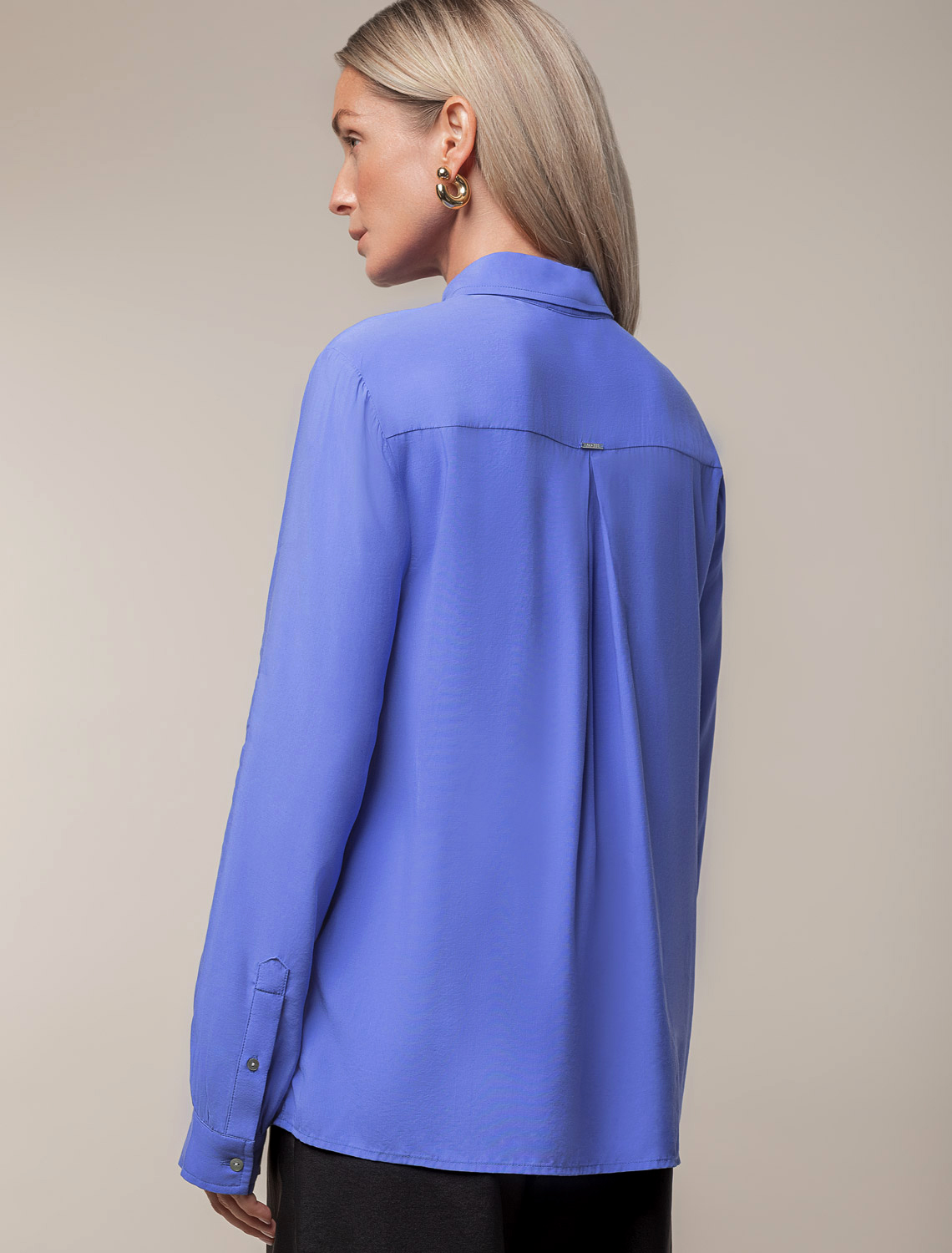 Блузка выполнена из премиальной вискозы и лиоцелла. На спинке изделия фирменный логотип бренда. Застежка на пуговицы из натурального перламутра. Приятная на ощупь ткань охлаждает кожу в жаркую погоду. Отлично впишется в нестрогий офисный дресс-код или в расслабленном повседневном образе с джинсами.