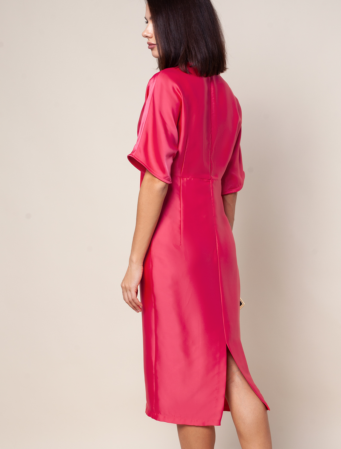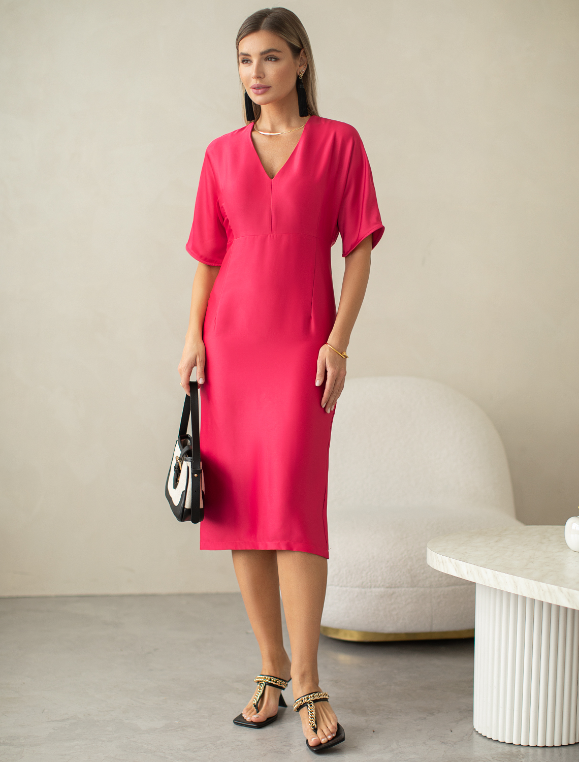 Платье с глубоким V-вырезом и рукавом «летучая мышь» выполнено из тончайших нитей плотного сатина, плетение которых создает полуматовый блеск, напоминающий натуральный шёлк. Модель с длинными глубокими вытачками спереди и сзади выглядит скульптурно, но за счет струящейся ткани сохраняется плавность силуэта. Ткань почти не мнется и имеет легкий вес. Комфортная длина ниже колена и застежка на молнию.