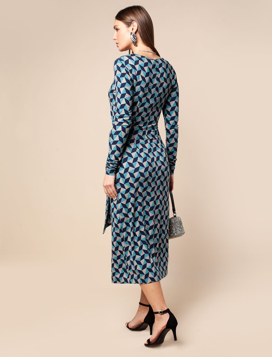 Платье на запАх сшито из трикотажной вискозы с эластаном. V-вырез с мини-копкой на борте с внутренней стороны для фиксации выреза декольте. Запах сходится и завязывается на боковой-пояс ленту. Модель подчеркивает достоинства и изгибы фигуры. А геометрический принт скрывает любые неровности. Роскошь и комфорт, одновременно подчеркивающие стиль, женственность и красоту.