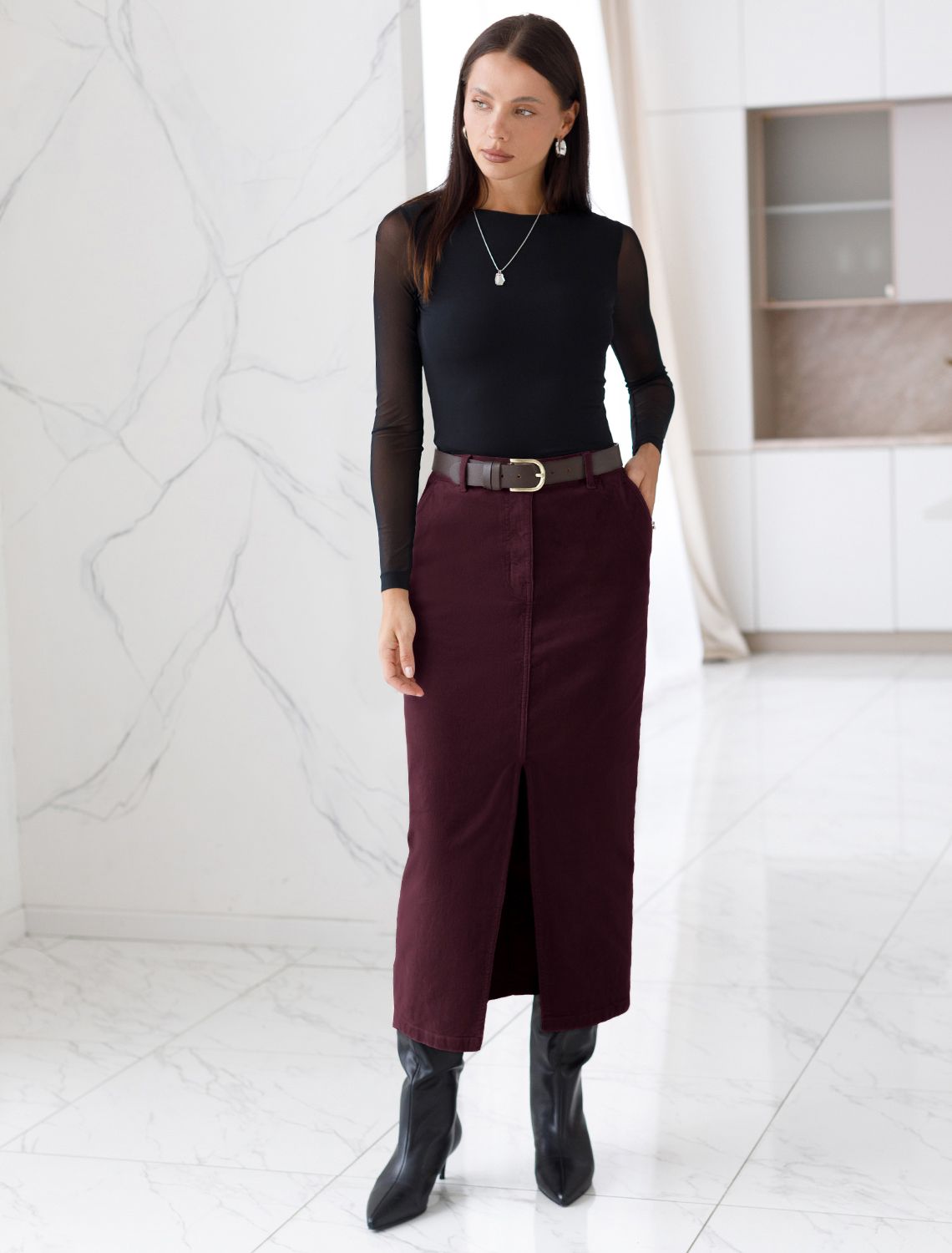 Юбка прямого кроя с выполнена из мягкого хлопкового микро-вельвета с добавлением эластана. Модель дополнена высоким разрезом спереди. Изделие комфортно садится по фигуре и не сковывает движения. Хорошо комбинируется с вязаным трикотажем, блузками и денимом. Также прекрасно станет альтернативой деловым низам в нестрогом офисном дресс-коде.