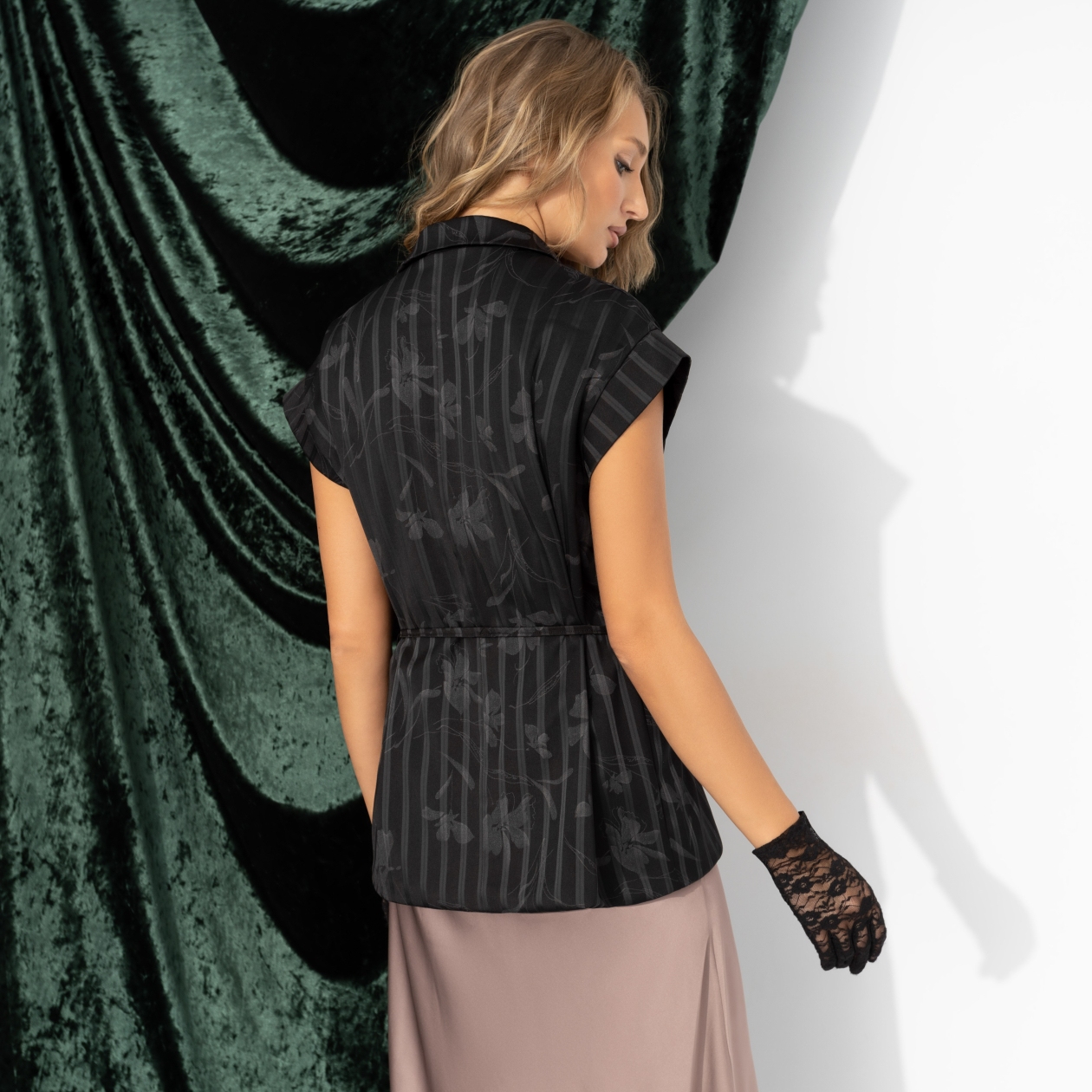 Полночь на бульваре Сен-Жермен. Шёлковый блеск и лёгкий аромат загадки. Этот жилет будто сошёл с экрана классики французского кино – там, где героиня всегда выбирает себя. Жилет выполнен из благородной костюмной ткани с лёгким металлическим блеском. Прямой силуэт регулируется поясом-шнуром, а широкие плечи формируют чёткую линию силуэта.