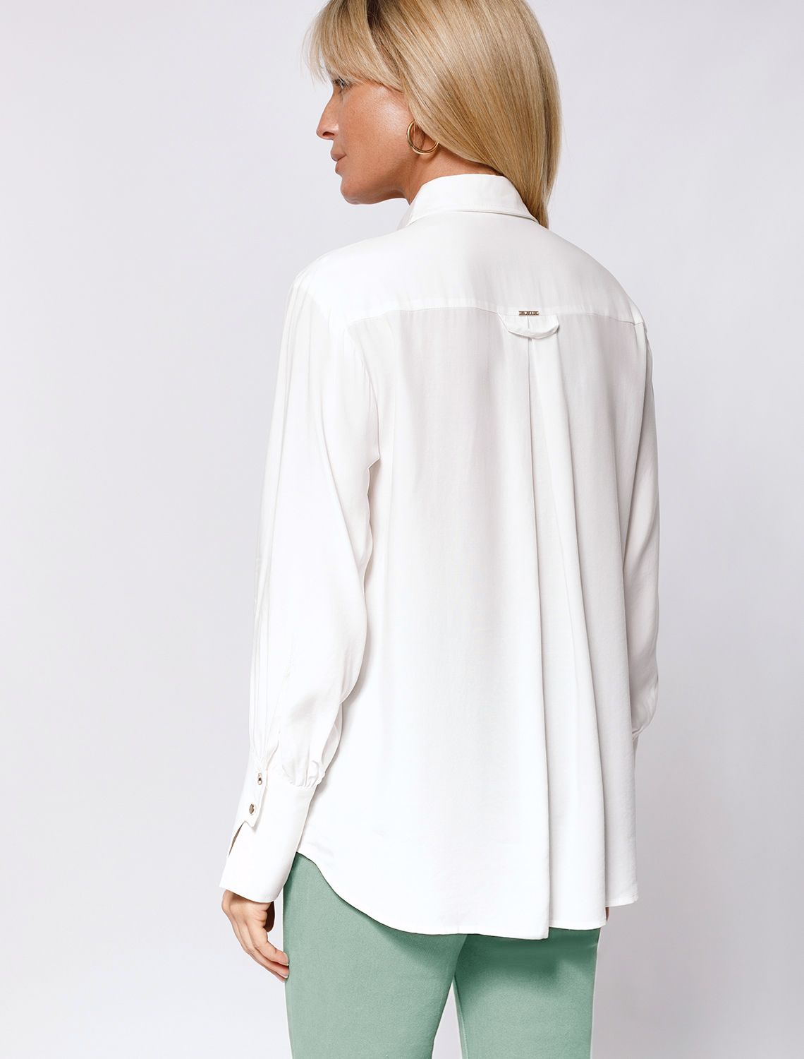 Блузка с имитацией карманов и удлиненными манжетами выполнена из премиальной вискозы и лиоцелла. На спинке изделия фирменный логотип бренда. Имитация карманов позволяет этому элементу выглядеть аккуратно без складок и фалд, которые вероятны на такой пластичной ткани.Застежка на золотистые пуговицы. Приятная на ощупь ткань охлаждает кожу в жаркую погоду. Отлично впишется в нестрогий офисный дресс-код или в расслабленном повседневном образе с джинсами.