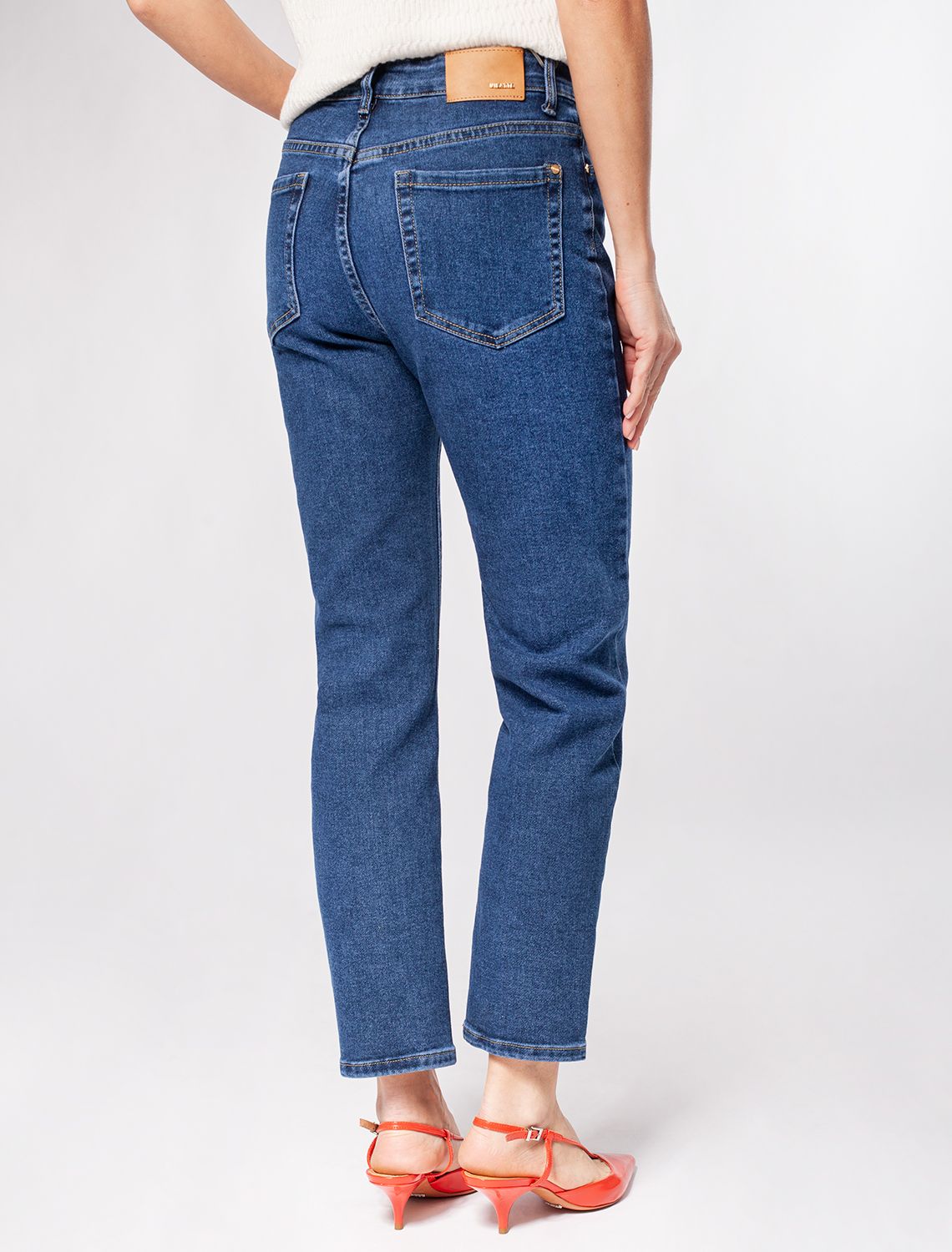 Джинсы прямого силуэта сшиты из эластичного денима средней плотности. Универсальные и практичные для любого времени года с кроссовкамии, туфлями и сапогами. На верх с классической блузкой, водолазкой и свитером крупной вязки.