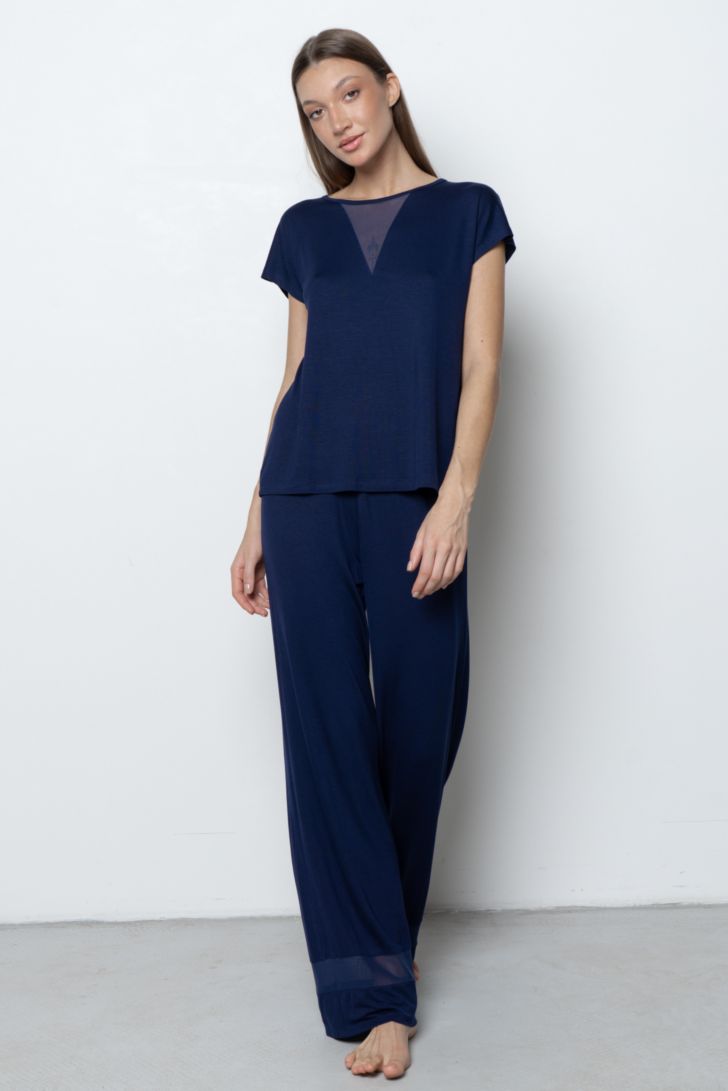 Струящаяся пижама из нежного бамбука состоит из футболки с коротким рукавом и свободных брюк. Футболка прямого силуэта с коротким рукавом и круглым вырезом горловины, дополненной полупрозрачной V-образной вставкой из сетки по линии груди. Линия плеча слегка приспущена. Брюки прямого силуэта на комфортном поясе с мягкой резинкой. По низу штанин — широкие вставки из сетки, создающие лёгкий полупрозрачный акцент.