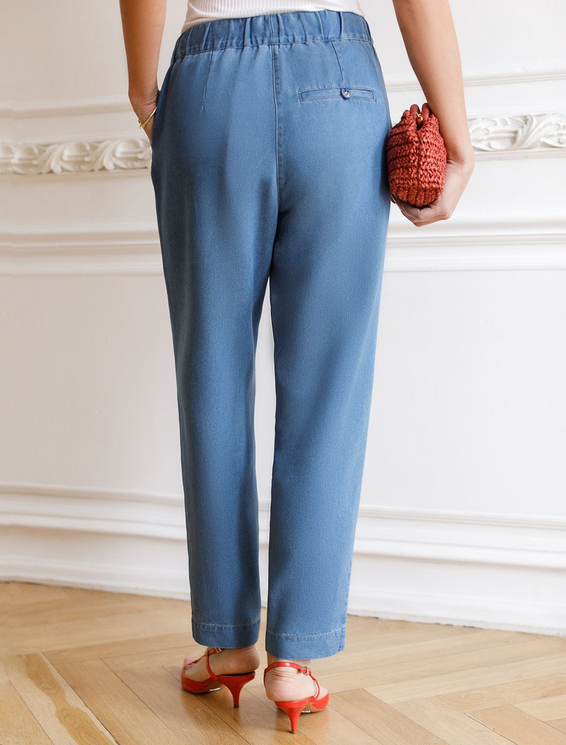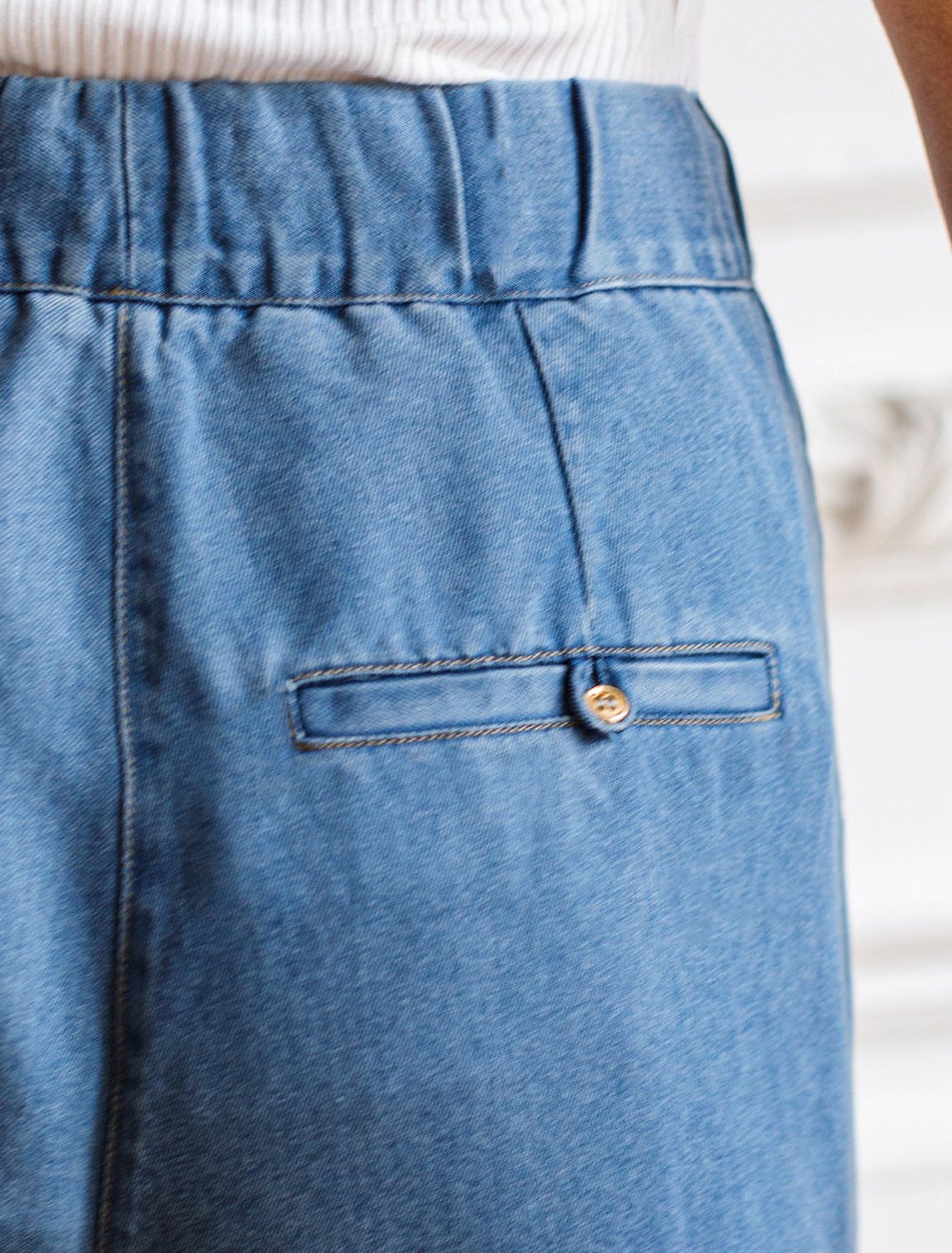 Брюки-дудочки выполнены из лиоцелла. Модель с эластичным поясом на резинке дополнена регулируемым шнуром из основного полотна, боковыми карманами и одним карманом сзади. Ткань с характерным атласным блеском полностью имитирует обычный деним, но в тоже время намного более мягкая, плавно струится по телу, хорошо драпируется и охлаждает кожу в жаркое время года. Изделие сочетается в костюме с блузкой D59.017