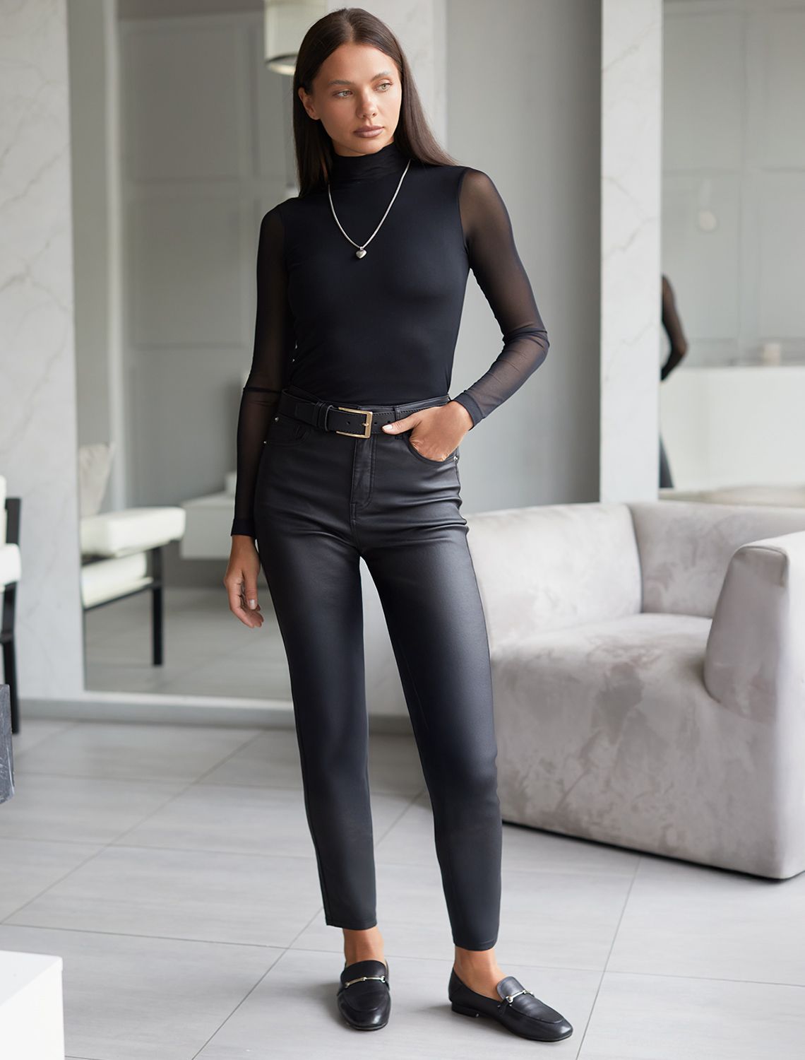 Удобная посадка по фигуре подчеркивает силуэт, а покрытие создает эффект натуральной кожи, добавляя образу дерзости. Благодаря эластичному материалу брюки не сковывают движений, обеспечивая максимальный комфорт в течение всего дня. Универсальная модель коричневого цвета легко сочетается с объемным свитером для повседневного лука или с классической рубашкой и блейзером для более строгого образа. Практичный материал устойчив к износу и не требует особого ухода. Эти брюки – находка для тех, кто ценит стиль, удобство и современные тренды.