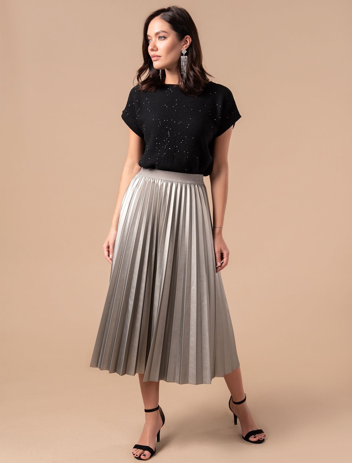 Легкий джемпер черного цвета с цельнокроеным коротким рукавом выполнен из хлопковой пряжи с вкраплением сияющих пайеток, что придает особую изысканность. Стильный джемпер связан изнанкой, пряжа отличается легкостью и приятной текстурой, совершенно не колется, обеспечивает комфорт даже при длительном использовании, а натуральные волокна поддерживают оптимальный температурный баланс. Свободный крой с эластичной манжетой по низу и цельнокроенный рукав создают расслабленный, но аккуратный образ. Нарядный джемпер подойдет девушкам и женщинам больших размеров, в нем вы будете чувствовать себя уверенно и свободно в любой ситуации. Мерцающий эффект пайеток добавляет образу выразительности и индивудуальности. Мерцающее полотно добавляет особого шарма вашему образу, делая его уместным как на праздник, так и для повседневного выхода. Новый год, вечеринка или любое другое мероприятие пройдут ярко — сияющие пайетки создают ощущение праздника в каждом движении. Для спокойного повседневного аутфита добавьте к этому эффектному джемперу спокойный низ, близкий по цвету, без дополнительных элементов декора.