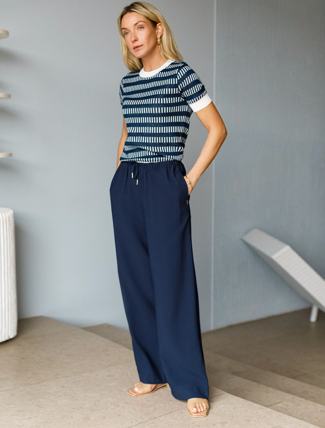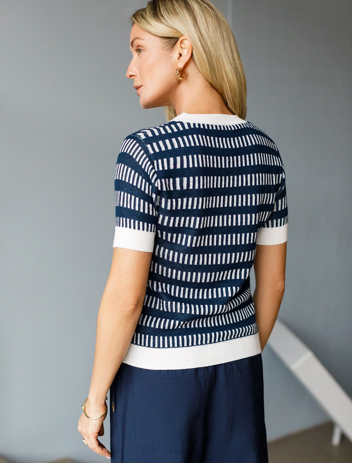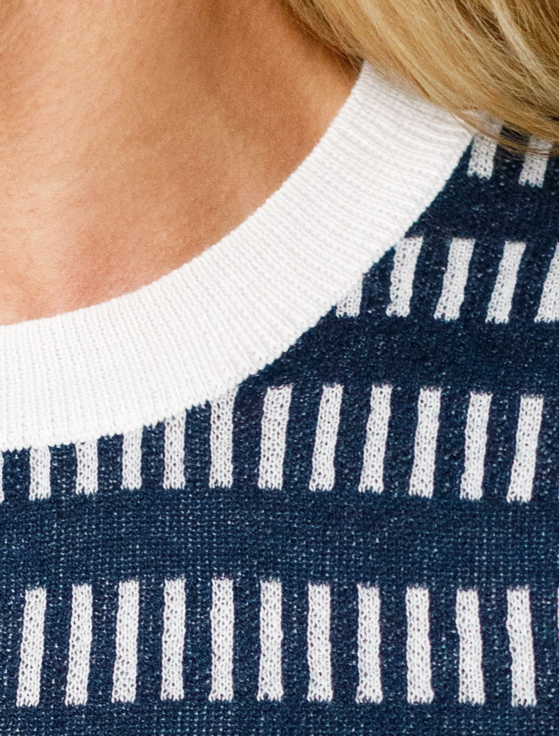 Топ тонкой вязки выполнен из полиэстера с добавлением вискозы. Вертикальный вывязанный принт визуально стройнит и вытягивает силуэт. Добавление в состав ПЭ способствует легкости и износостойкости изделия. Мягкая пряжа приятно ощущается на теле и дарит настоящий комфорт в теплое время года. Хорошо сочетается с белыми и синими низами поддерживая морской стиль