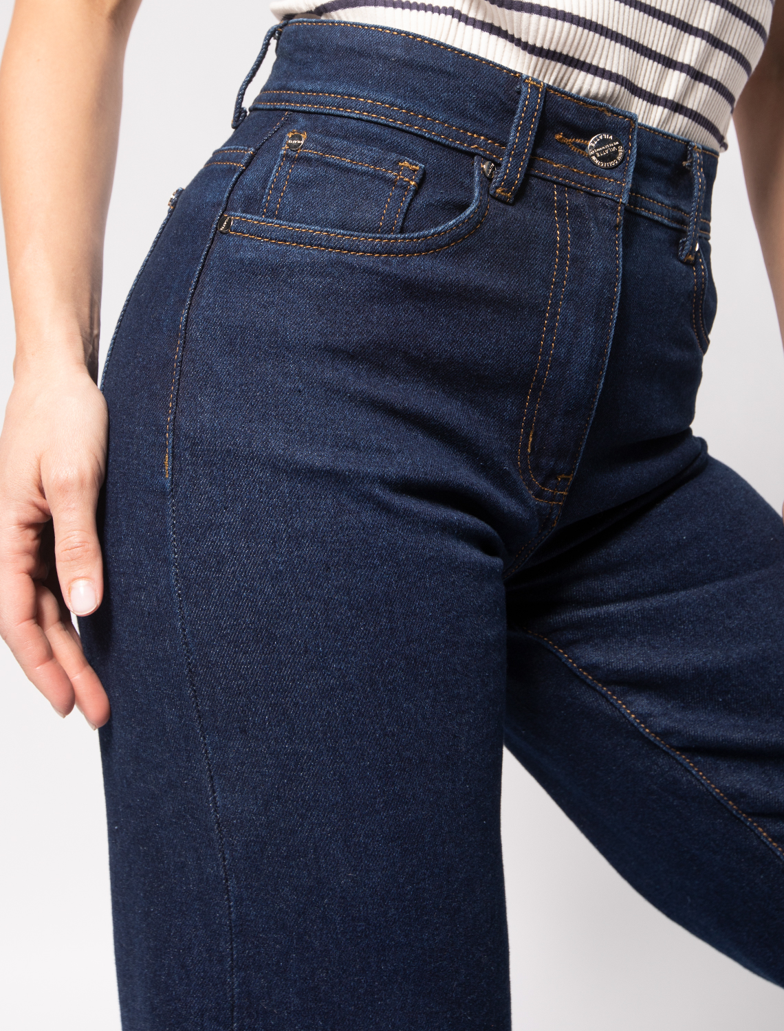 Темно-синие джинсы-кюлоты выполнены из эластичного денима. Высокая талия подчеркивает силуэт. Комфортная длина позволяет сочетать изделие с высокими сапогами и ботинками. Составьте уютный образ вместе со свитером крупной вязки или кашемировым жакетом. Изделие дополнено высококачественной металлической фурнитурой с логотипом бренда.