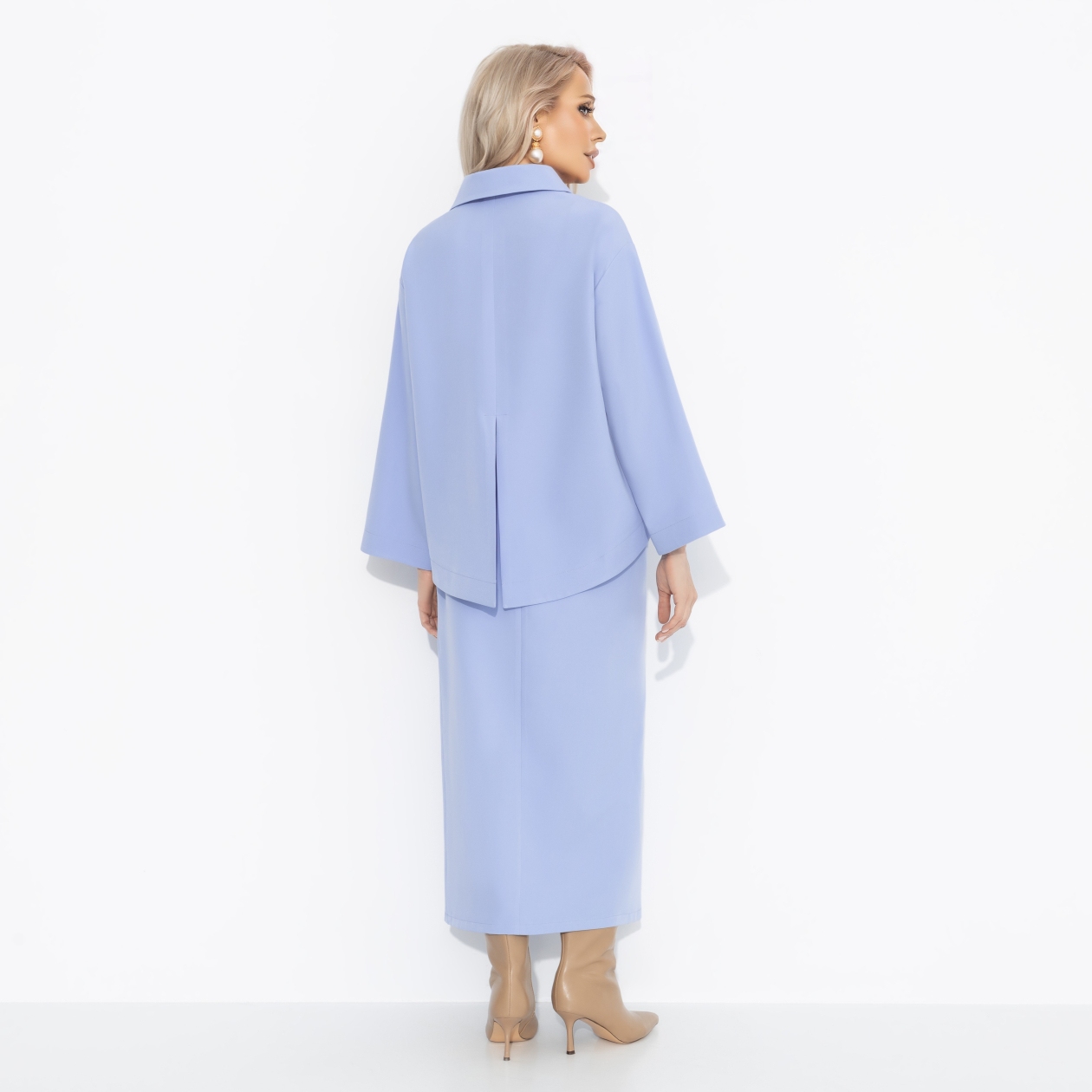 Идеальный небесно-лавандовый оттенок, созданный, чтобы добавить жизни в зимний гардероб. Этот сет ЧАРУТТИ хочется надеть в день, когда вместе с любимым вы отправляетесь на шопинг – выбирать подарки, смеяться, пробовать пирожные и ловить взгляды друг друга в отражениях витрин. С таким костюмом даже морозная зима кажется теплее и романтичнее. Свободный крой, утончённая юбка с разрезом, настроение для ярких зимних дней!