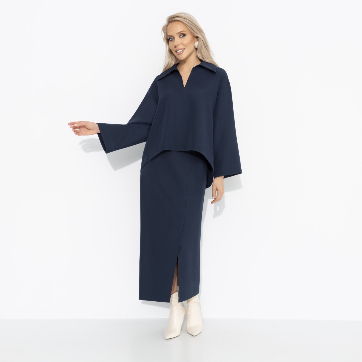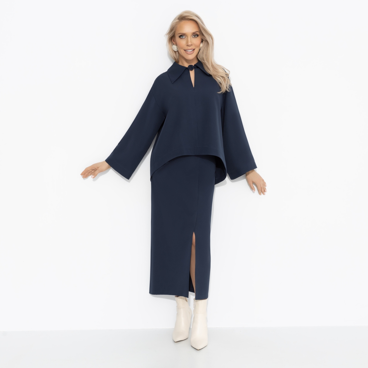 Оттенок темного индиго – для зимнего офиса, где важна уверенность в каждом движении. Костюм ЧАРУТТИ поможет легко привлекать внимание партнёров и инвесторов, вести важные переговоры и быть магнитом для деловых перспектив. Строгий крой и длина подчеркивают профессионализм, но пространство для индивидуальности и комплиментов остаётся.
