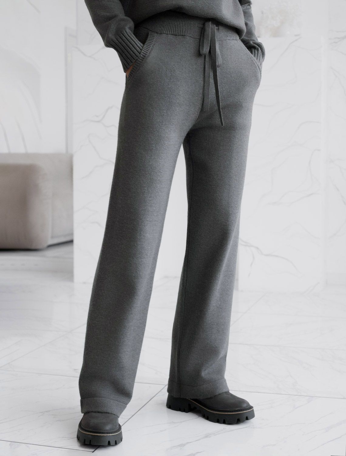 Брюки прямого силуэта выполнены из мягкой пряжи с кашемиром. Нежная пряжа приятно ощущается на теле, сохраняя комфортное тепло. Не колется и не перегревает. Пояс регулируется вязаным шнуром, позволяя носить изделие на талии или чуть ниже. Модель сочетается с любым верхом из коллекции с кашемиром.