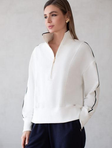 Свитшот выполнен из эластичного футера двухнитки. Изделие дополнили аппликацией из металлических страз. Перевод: Life is now - живи сейчас. Расслабленный стиль поддерживает спущенная линия плеча, свободный силуэт и разрезы по бокам. Модель сочетается в костюме с брюками D44.135, D44.136, D44.137 и юбкой D46.034