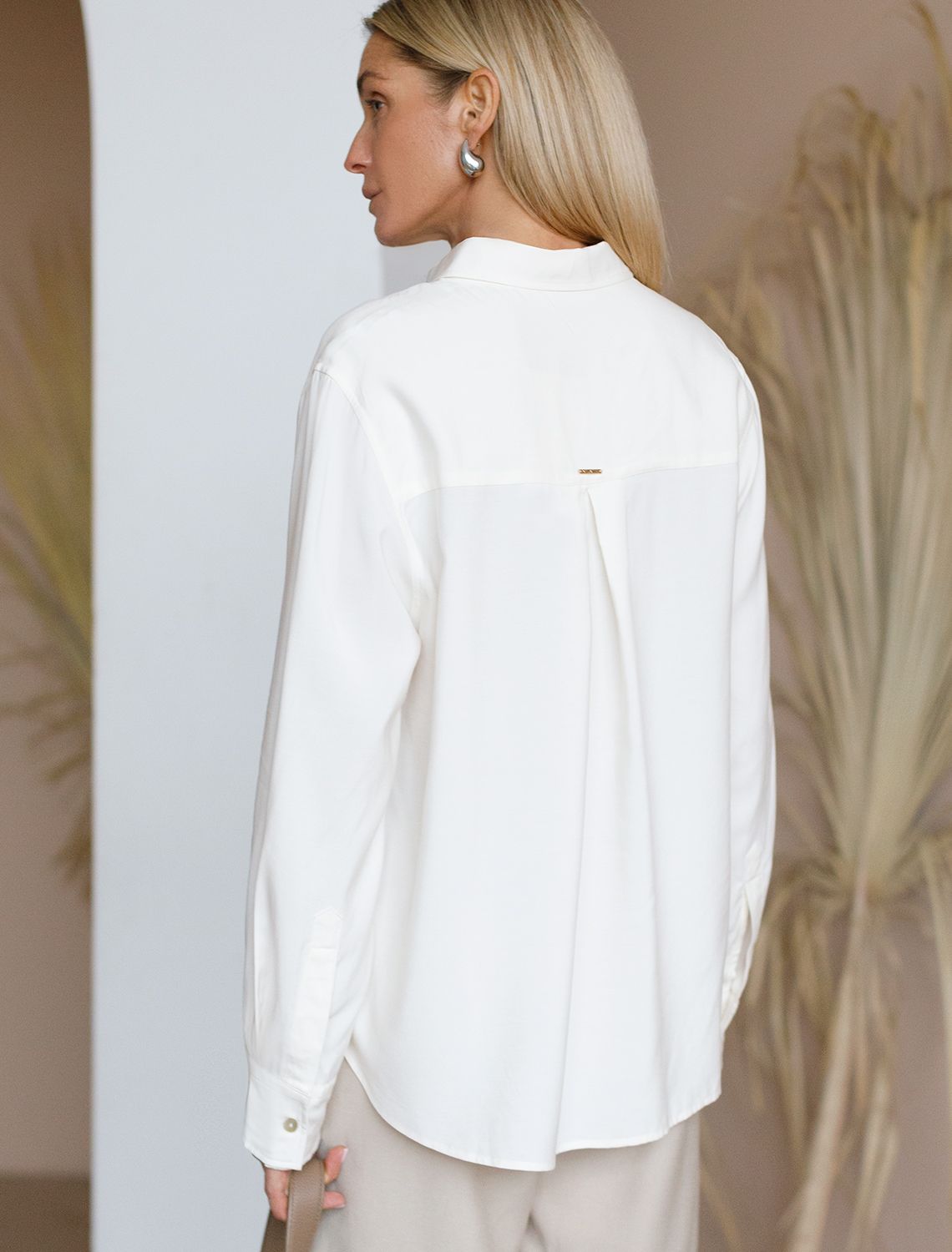 Летящая блузка с отложным воротником выполнена из лиоцелла с вискозой. Лаконичная модель с полуматовым блеском дополнена пуговицами из натурального перламутра. За счет премиальной вискозы в составе, ткань отлично пропускает воздух. На спинке изделия расположен фирменный логотип бренда. Блуза будет одинаково хорошо смотреться и в повседневном наряде, и в образе для офиса.