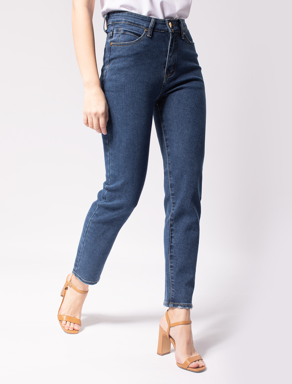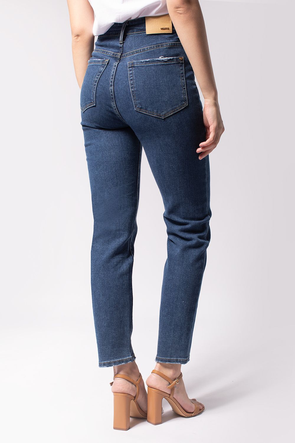 Синие джинсы из плотного прочного хлопка с добавлением нитей эластана. Укороченная модель изящно открывает лодыжки. Высокая посадка грамотно подчеркивает силуэт. Данная модель легко и безупречно поможет составить модный образ вместе с трикотажным поло, свободной блузкой, футболкой или жакетом.