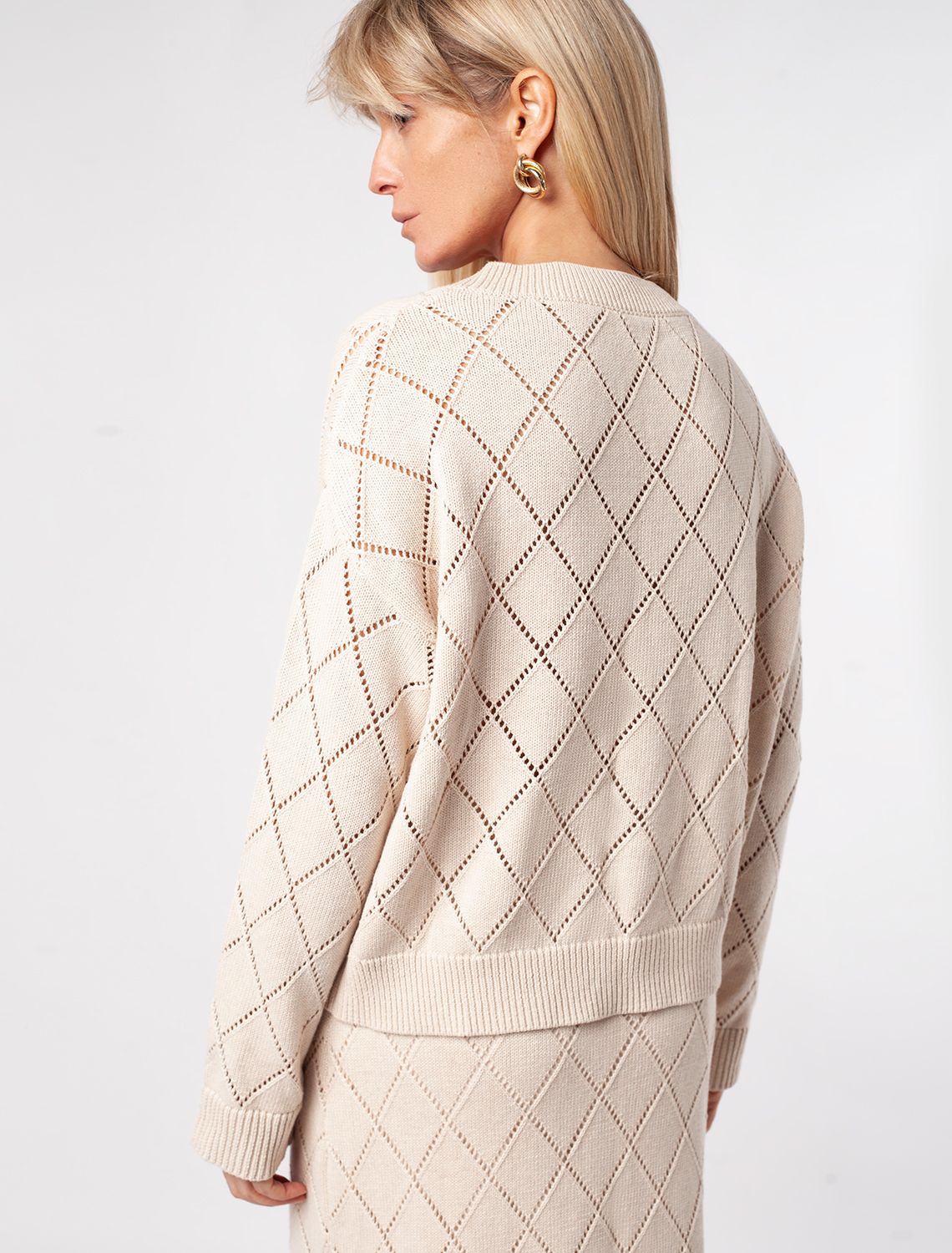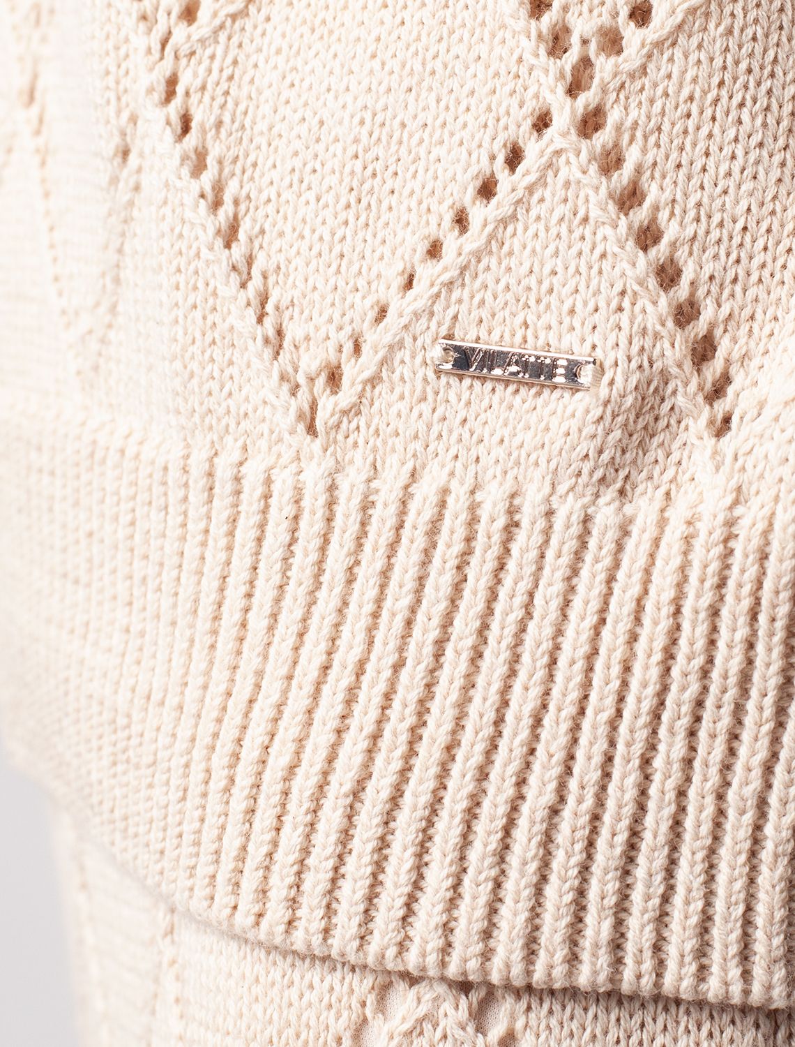 Укороченный джемпер выполнен узорной вязкой из мягкой хлопковой пряжи. Тонкий ажурный трикотаж идеально подходит для теплой весны и лета, в нем будет комфортно и не жарко. Изделие дополнено фирменным логотипом бренда. Сочетается в костюме с юбкой D36.013 и очень хорошо со светлым денимом.