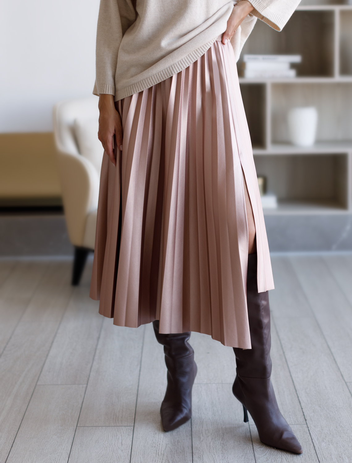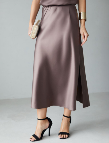 Асимметричная плиссированная юбка выполнена из мягкой эко-кожи. Посадка на талии акцентирована поясом из эластичной вельветовой ленты. Перламутровое покрытие изящно сияет и легко поможет создать роскошный вечерний образ. На уровне ассиметричной линии спереди находится разрез, открывающий ноги. Атласное внутреннее покрытие обеспечивает идеальный комфорт при носке с колготками.