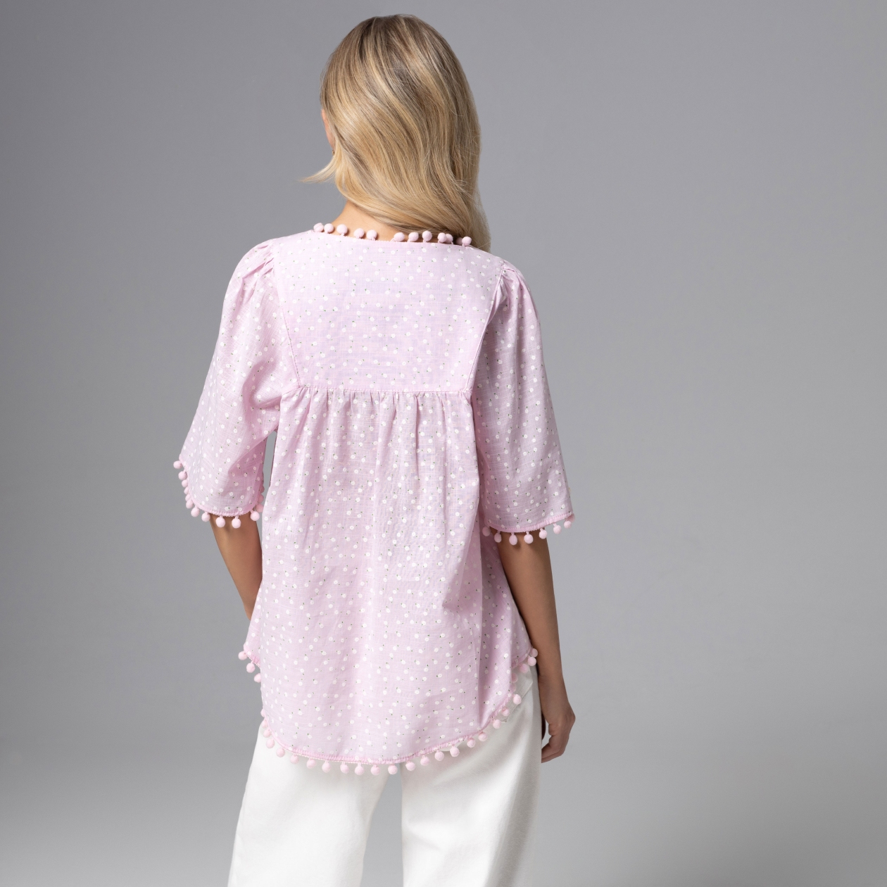 Каждый миллиметр блузы CHARUTTI из коллекции PREMIUM избалован вниманием – утонченные миниатюрные помпоны в строгой последовательности, выверенный крой, безупречный материал и цвет, разбивающий сердце. Нежность, возведенная в абсолют. Блуза свободного кроя из 100% хлопка. Хорошо смотрится на любом типе фигуры. Деликатная сборка по передней части изделия.