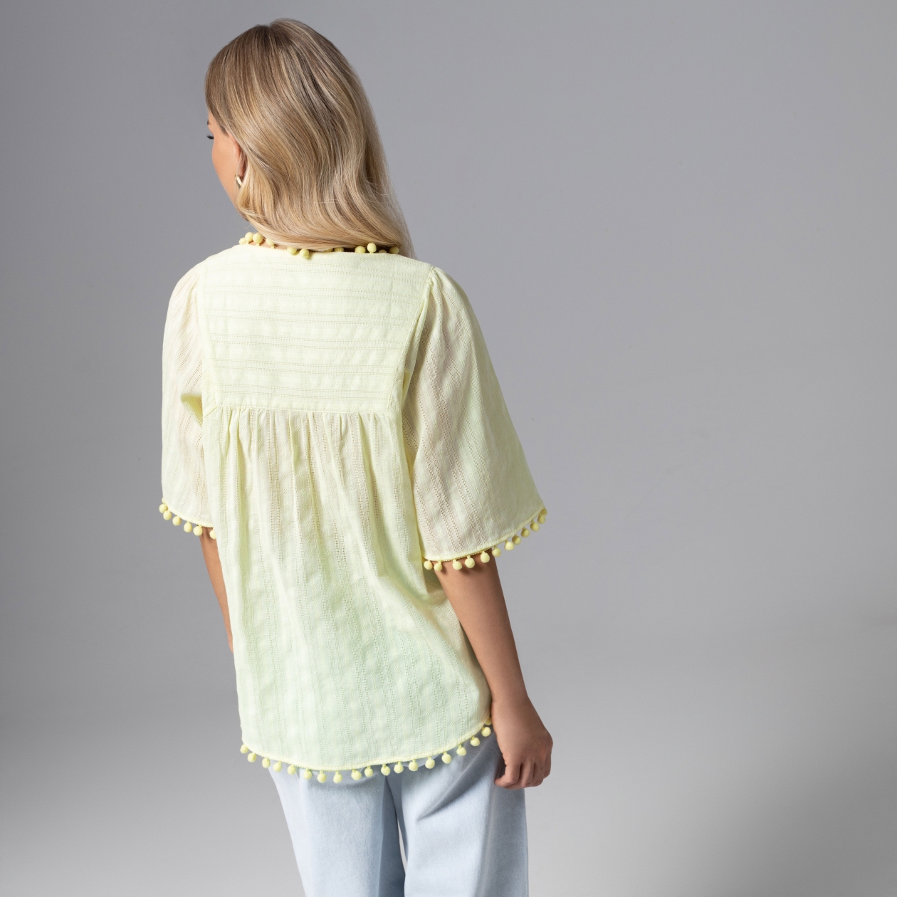 Каникулы в Каннах подтверждены. Блуза из хлопка премиального качества готова к путешествию. Миниатюрные помпоны уже мысленно игриво покачиваются во время прогулки вдоль моря. А вы уже чувствуете запах свежеиспеченного хлеба с томатной сальсой? Блуза свободного кроя в стиле бохо. Хорошо смотрится на любом типе фигуры. Деликатная сборка по передней части изделия.
