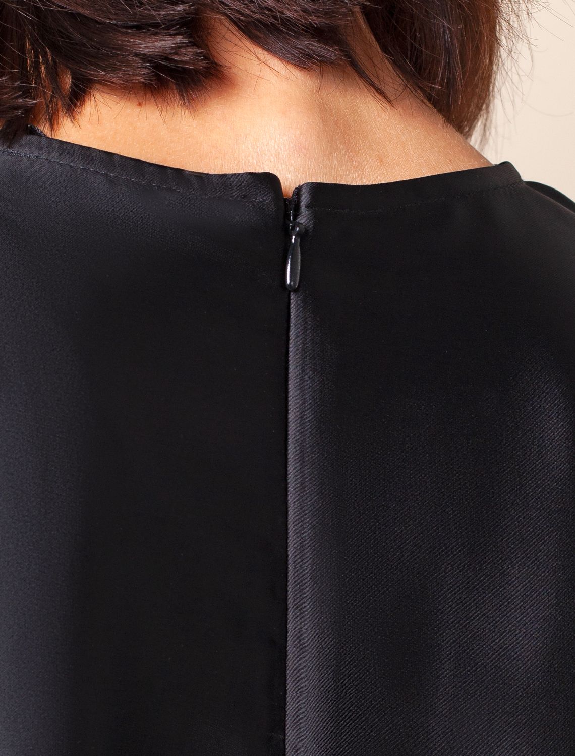 Платье с глубоким V-вырезом и рукавом «летучая мышь» выполнено из тончайших нитей плотного сатина, плетение которых создает полуматовый блеск, напоминающий натуральный шёлк. Модель с длинными глубокими вытачками спереди и сзади выглядит скульптурно, но за счет струящейся ткани сохраняется плавность силуэта. Ткань почти не мнется и имеет легкий вес. Комфортная длина ниже колена и застежка на молнию.