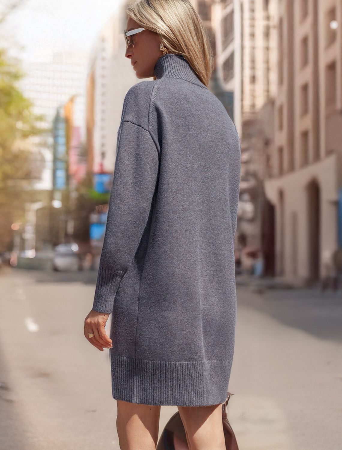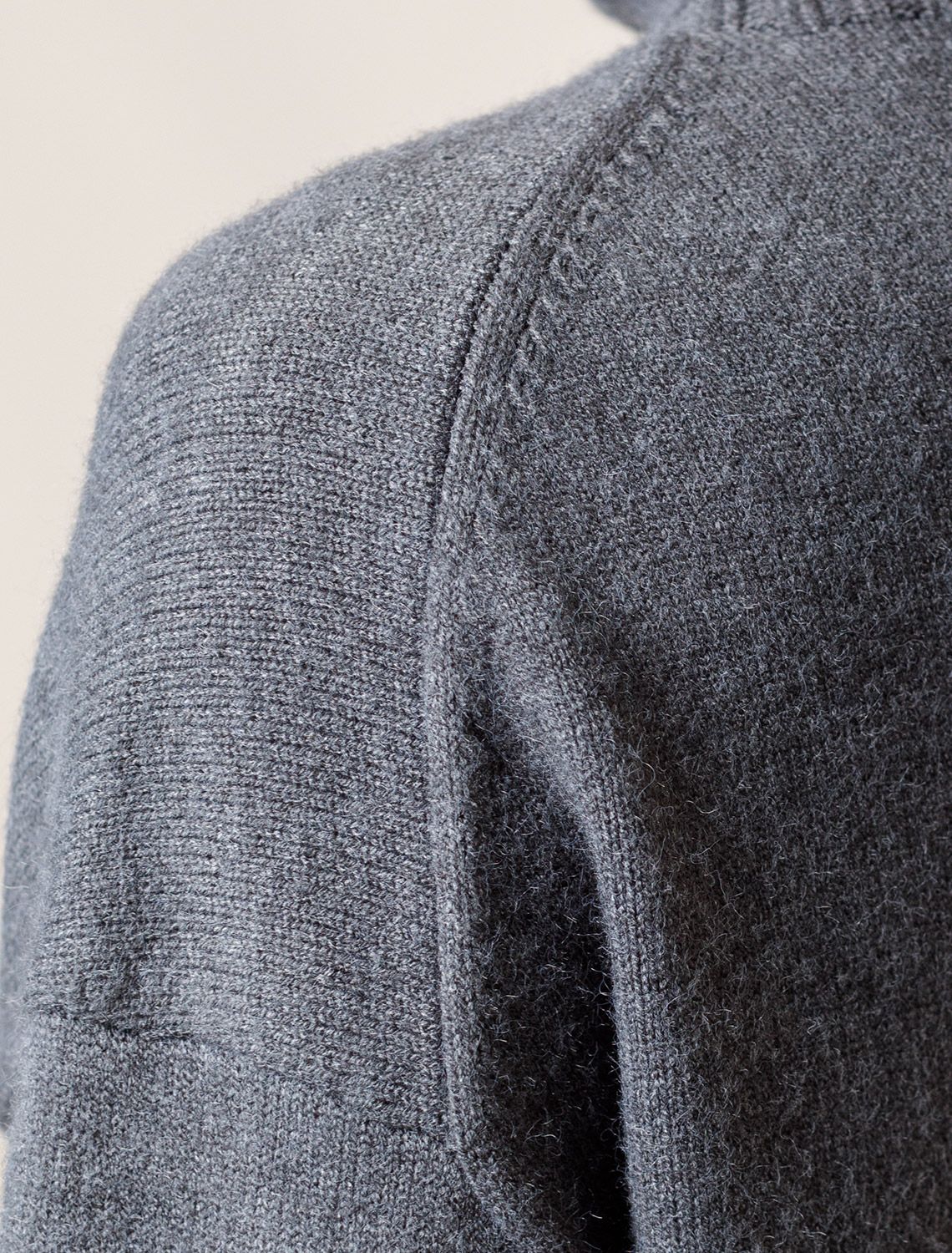 Платье с воротом стойка выполнено из мягкой меланжевой пряжи с кашемиром. Модель свободного силуэта со спущенным плечом хорошо впишется в расслабленные осенне-зимние аутфиты с высокими сапогами. Изделие очень приятное к телу, совершенно не колется и отлично сохраняет тепло при этом не перегревая.