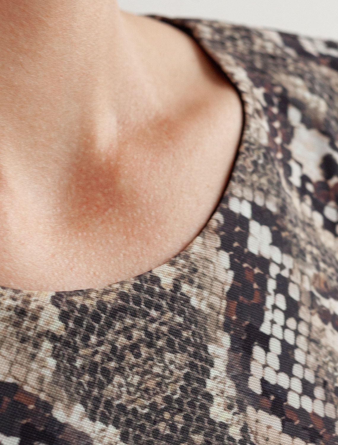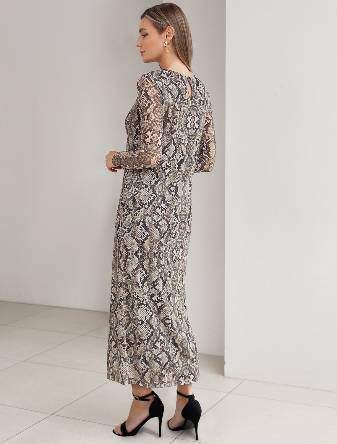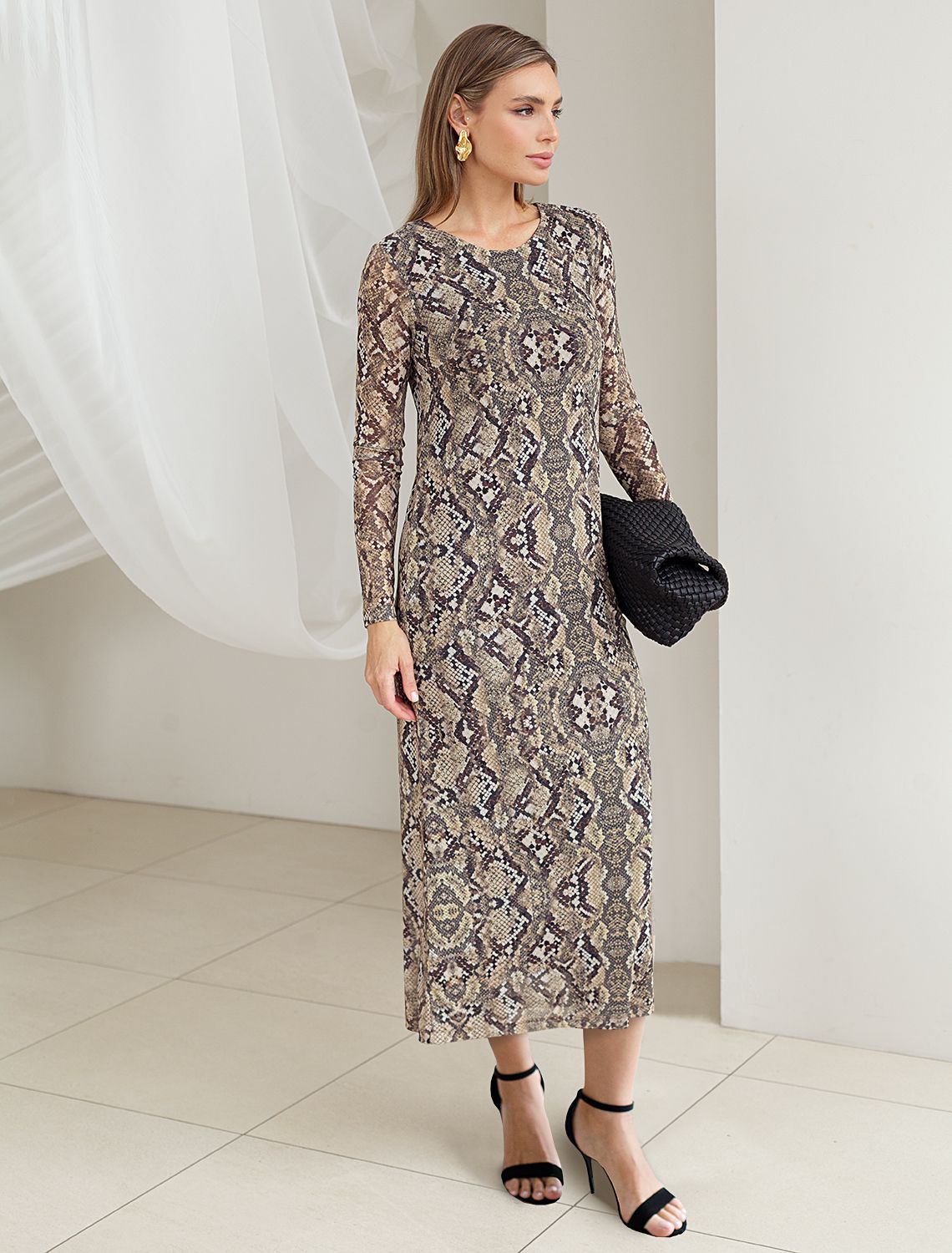 Трендовая модель с эффектным змеиным принтом в коричнево-бежевой гамме. Прямой крой из мягкой сетки на вискозной подкладке создает изящный силуэт. Игра полупрозрачной ткани и подклада добавляет глубину образу. Идеально для вечерних образов с золотистыми аксессуарами.