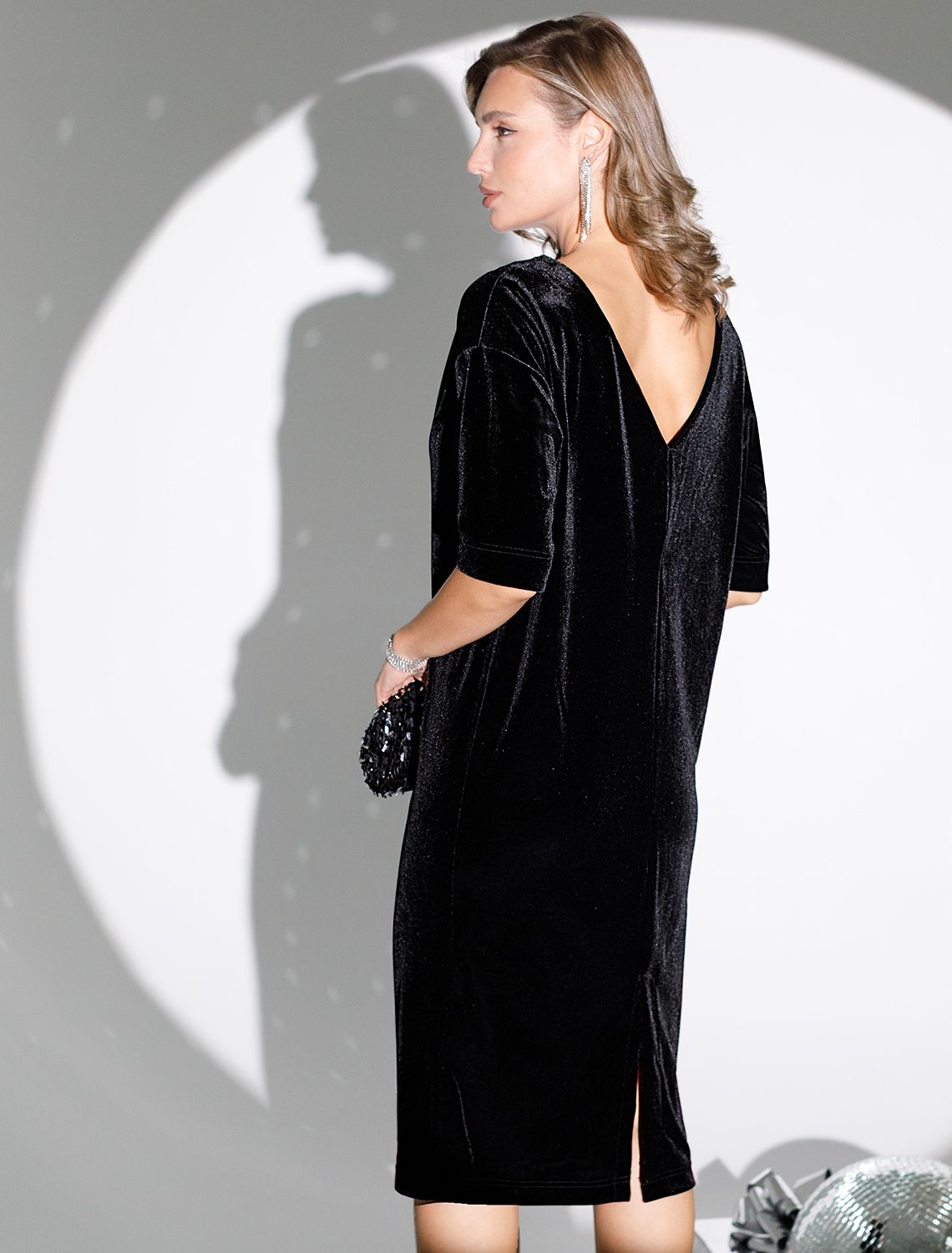 Невероятно изысканное платье длины миди выполнено из бархатистого материала в черном насыщенном цвете, который дарит тактильно приятное ощущение и мягкое прикосновение к коже. Благородный и лаконичный блеск ткани создает эффектность образу. Аккуратный небольшой разрез добавляет элегантности и женственности. Особое внимание привлекает глубокий, но не вызывающий V вырез на спине, создающий интересный акцент и подчеркивающий красивую линию спины. Элегантное платье подчеркивает стиль и комфорт благодаря свободному силуэту, а бархатистая ткань придает красивому платью приятную текстуру и визуальную глубину, делая его подходящим для различных мероприятий. Эластичность материала помогает сохранить форму изделия после стирки и длительного использования, ткань отличается дышащими свойствами, поэтому сохраняет оптимальный микроклимат тела.