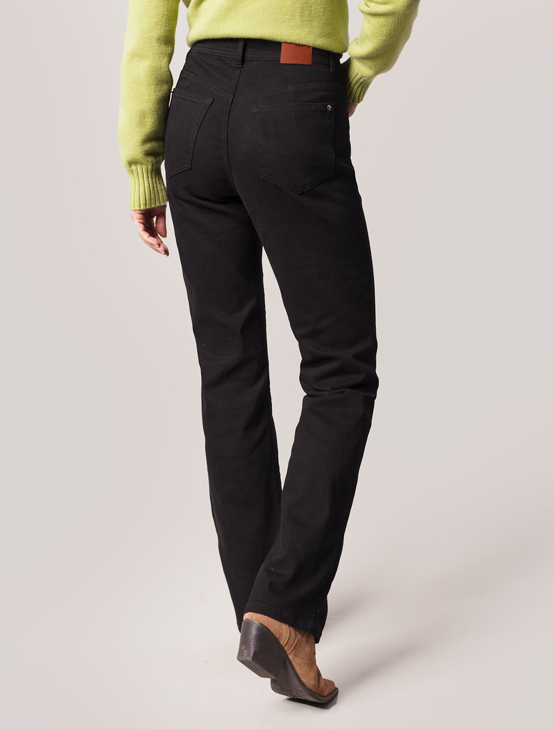 Прямые джинсы выполнены из эластичного денима. Удлиненная модель универсального черного цвета легко впишется в любой, даже строгий офисный образ с жакетом и блузкой. Комфортная посадка на талии подходит для любой фигуры, ткань хорошо тянется и не сковывает движений. На поясе сзади расположен нашивка из эко-кожи с логотипом бренда. Длина изделия позволяет выбрать к образу обувь на каблуке