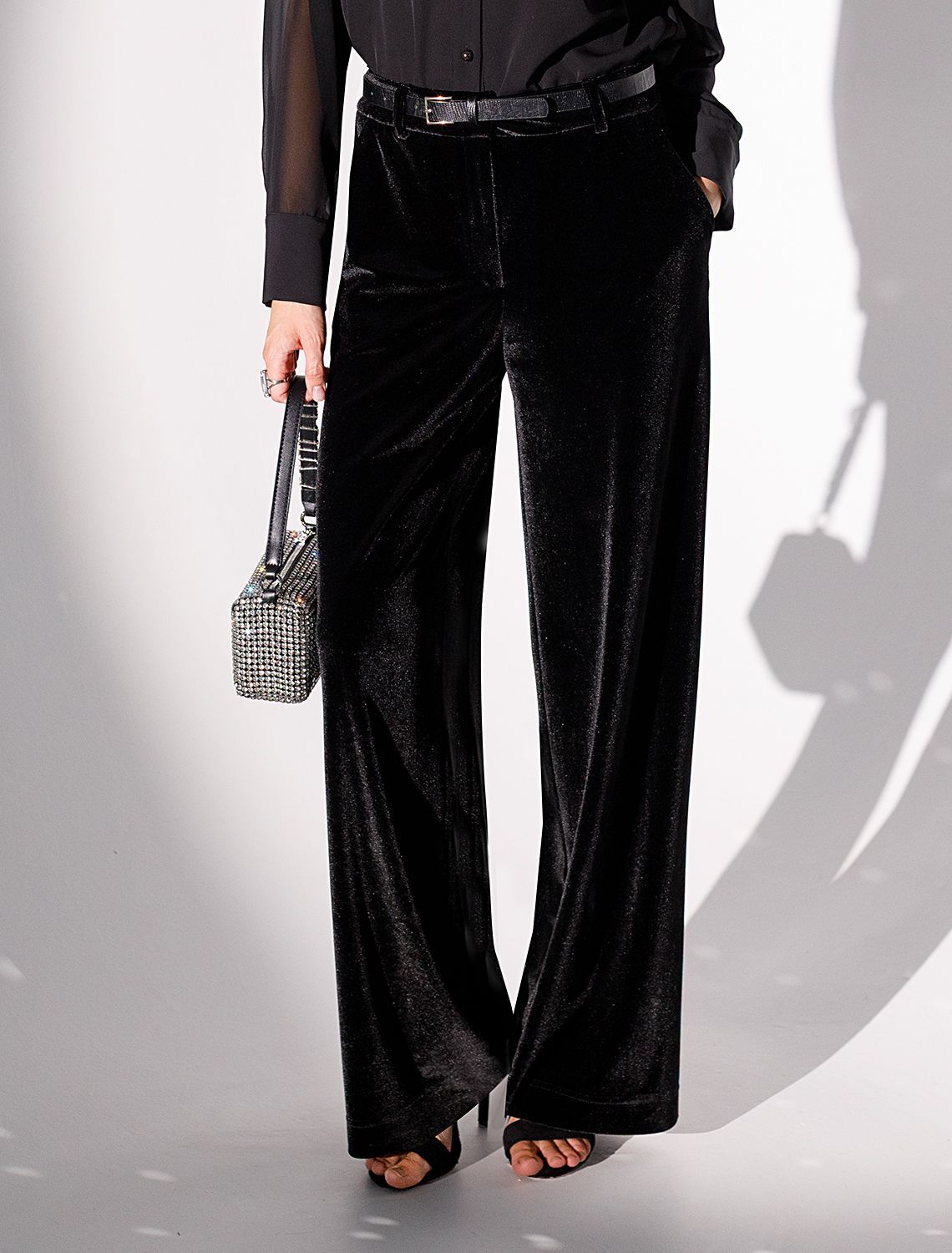 Нарядные длинные брюки смотрятся изысканно благодаря особому мягкому бархату с деликатным переливом — это не только модно, но еще и практично. Плотная структура ткани защищает от ветра и дарит ощущение уюта в прохладное время года. Их глубоки черный цвет добавляет образу выразительности и легко сочетается с разными элементами осеннего гардероба.