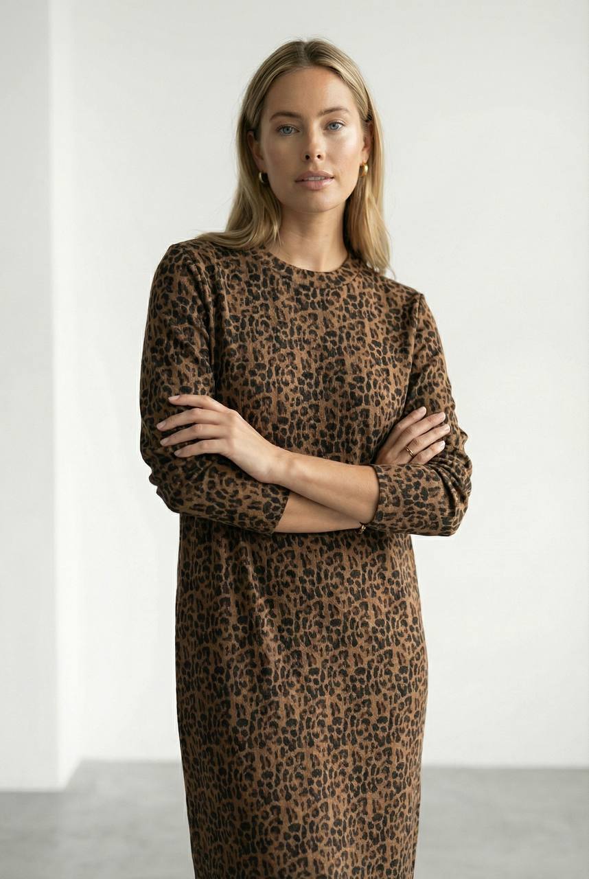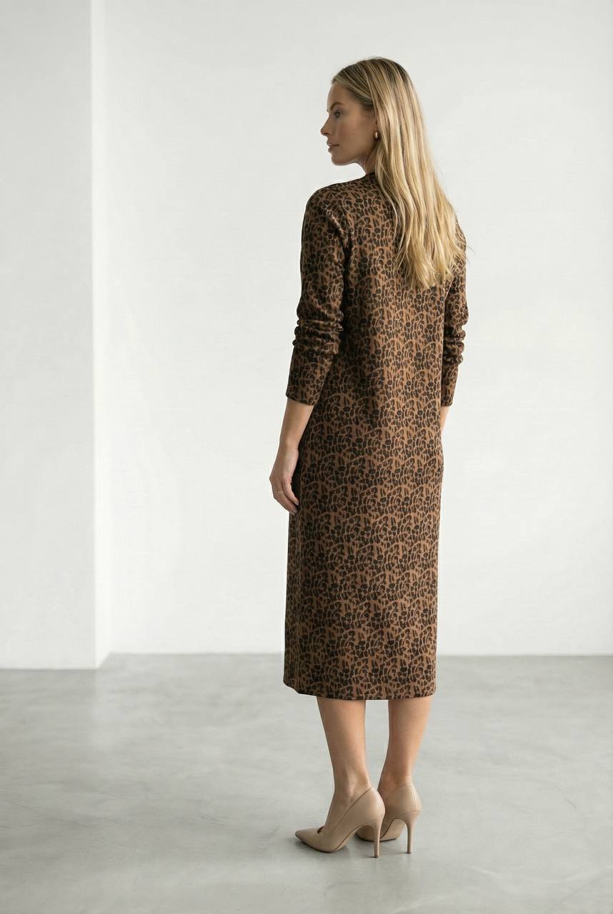 Платье полуприлегающего силуэта из эластичного полотна. Круглый вырез горловины оформлен притачной бейкой. Втачной длинный рукав.