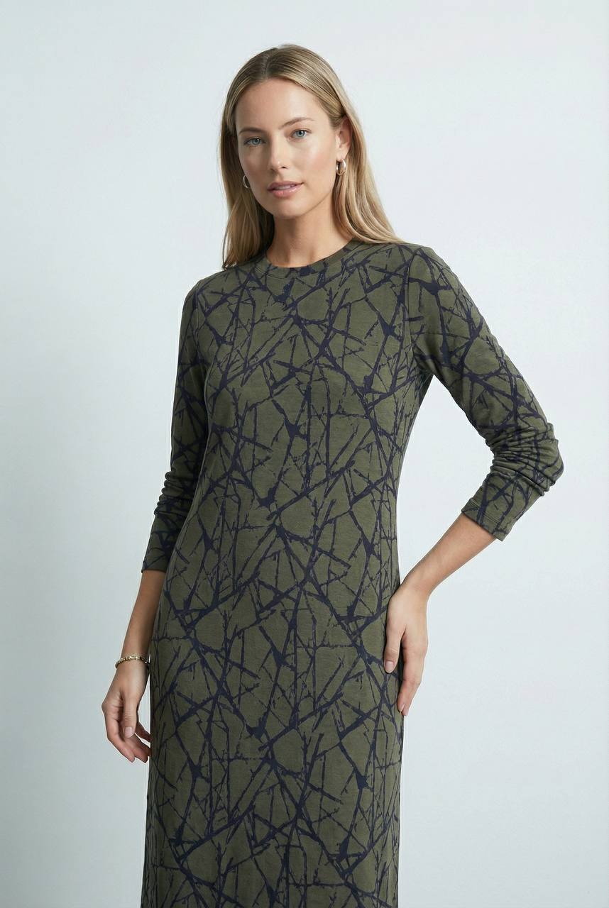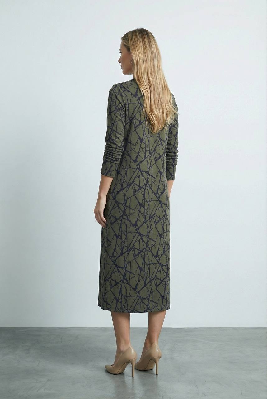 Платье полуприлегающего силуэта из эластичного полотна. Круглый вырез горловины оформлен притачной бейкой. Втачной длинный рукав.