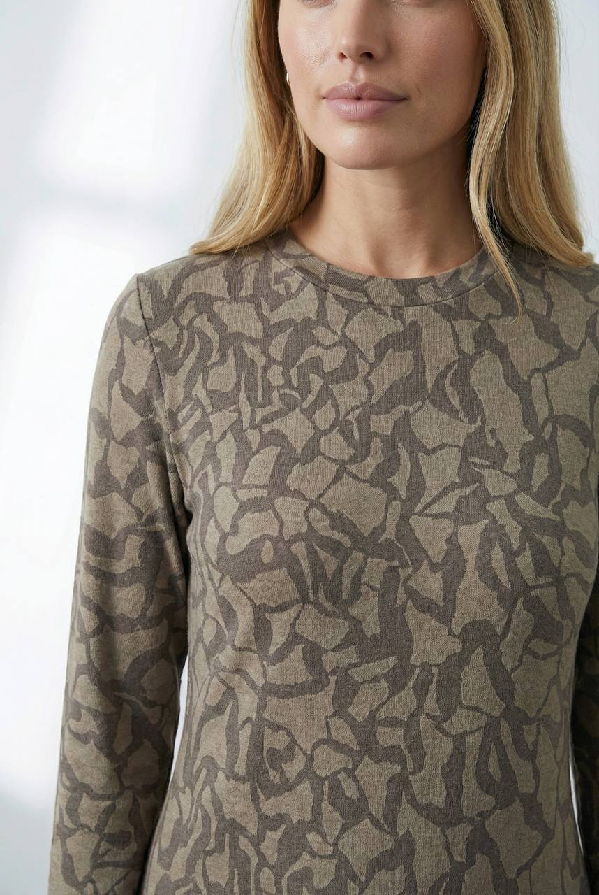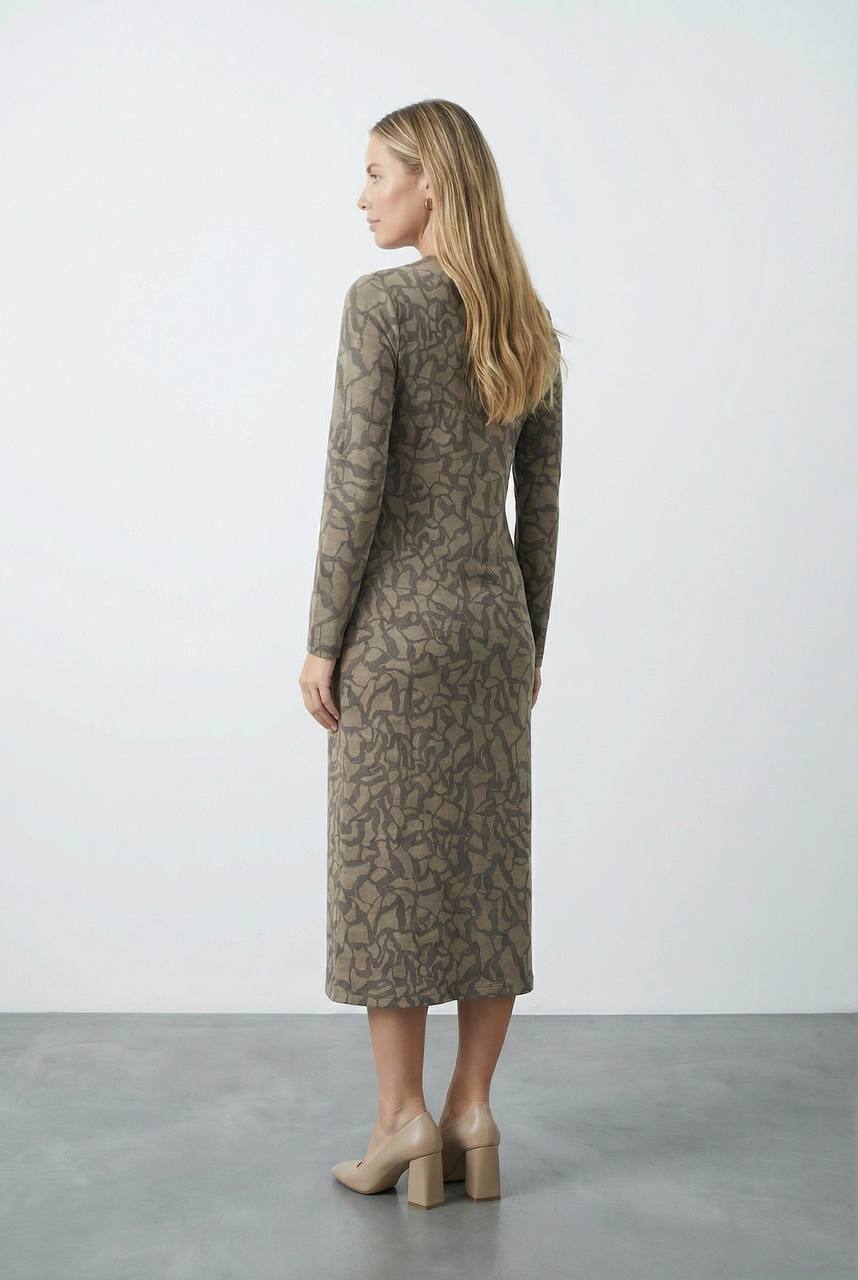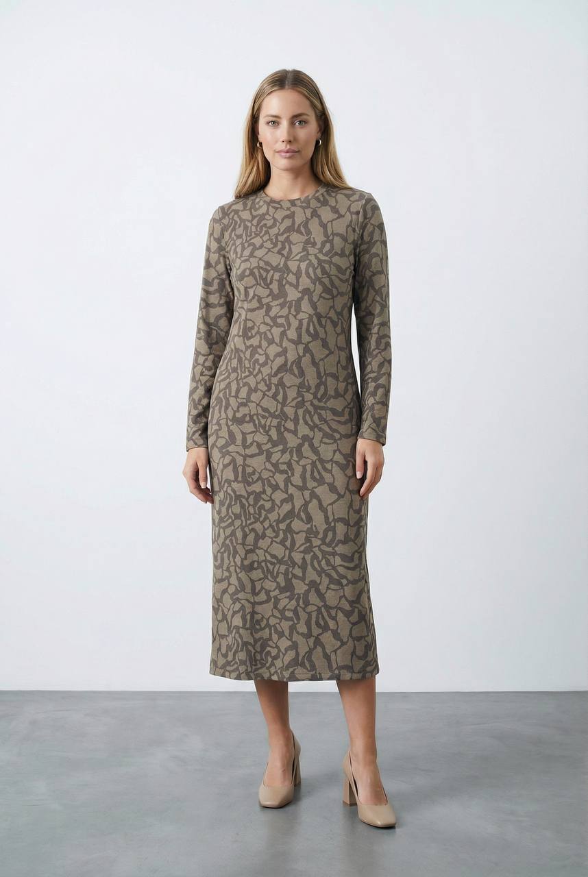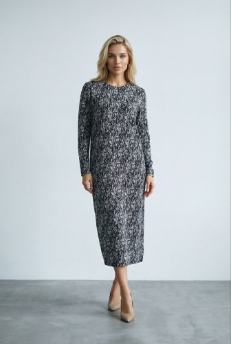 Платье полуприлегающего силуэта из эластичного полотна. Круглый вырез горловины оформлен притачной бейкой. Втачной длинный рукав.