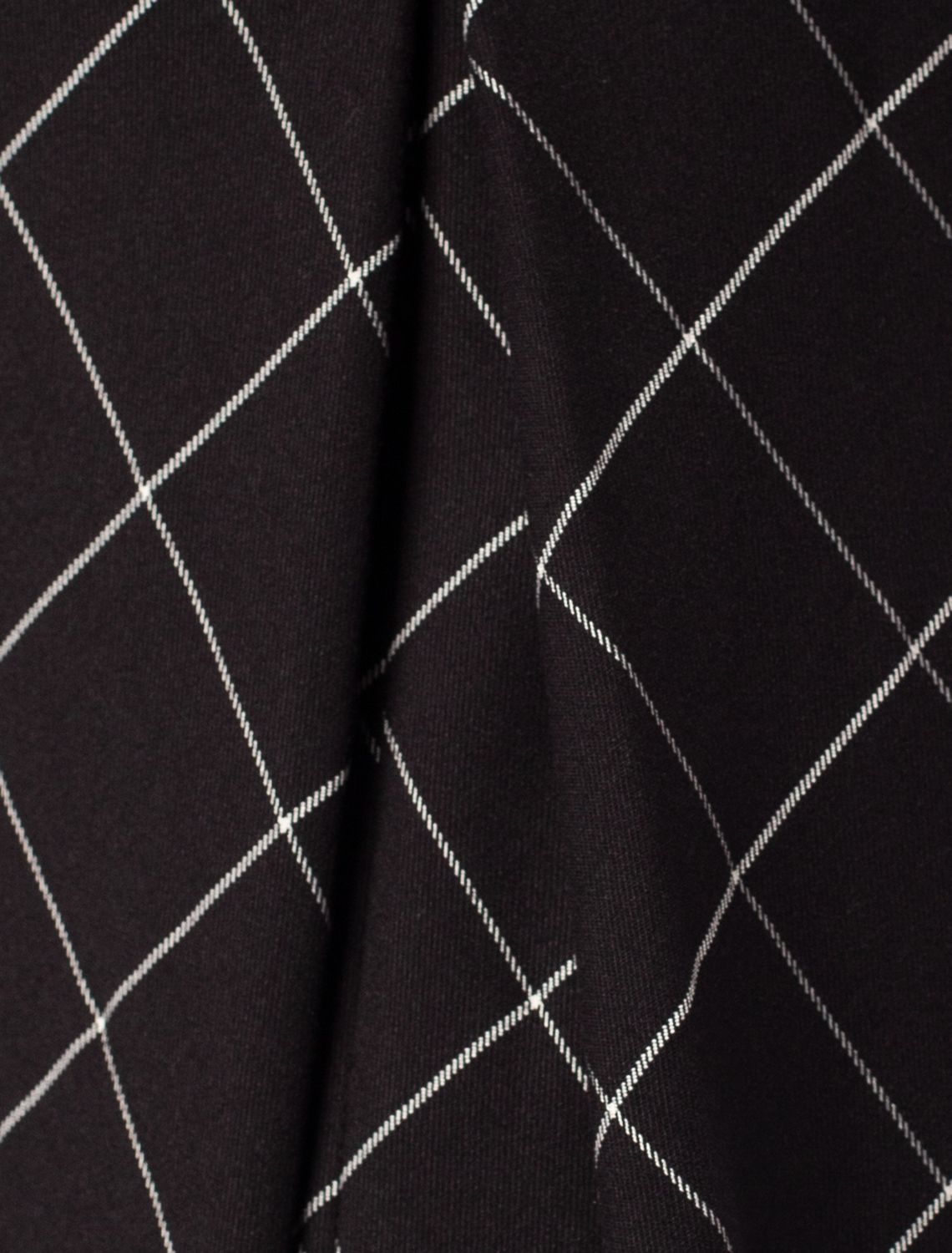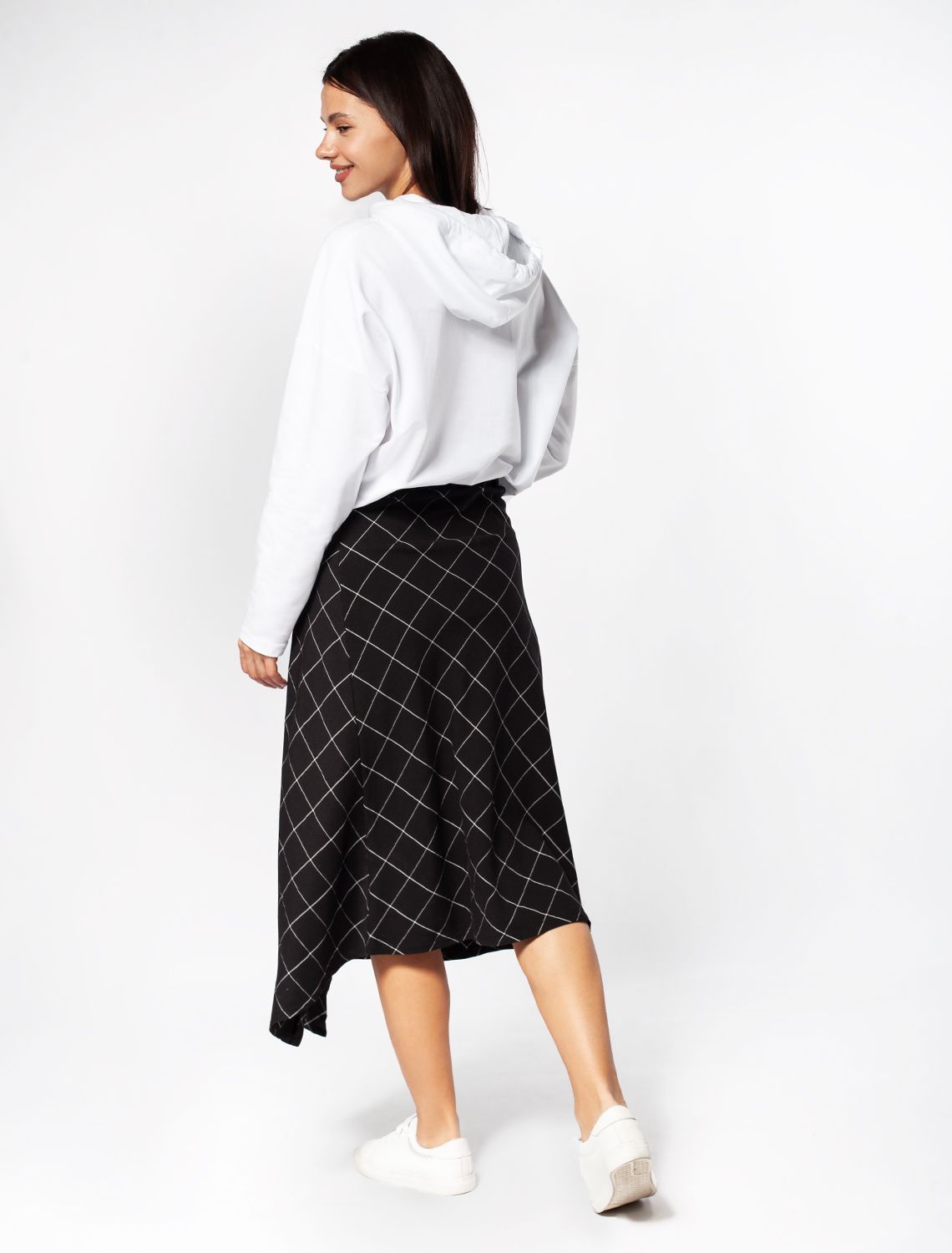 Юбка черного цвета в тонкую клетку кроеная по косой. Фокус внимания привлекает асимметрия, которая подчеркнута мягкой драпировкой. Для пошива модели использовали мягкую, эластичную ткань на основе вискозы с добавление полиэстера и нитей эластана. За счет чего, изделие не мнется и не сковывает движения. Сочетается с любой обувью.