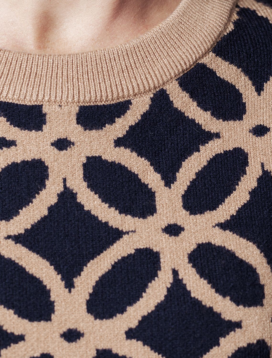 Джемпер жаккардовой вязки выполнен из мягкой пряжи на основе вискозы с добавлением кашемира. Очень приятная на ощупь пряжа дарит абсолютный комфорт, сохраняя оптимальную температуру не перегревая. Совет стилиста: модель с круглым вырезом и спущенной линией плеч гармонично дополнит повседневные образы с джинсами или брюками, при этом будет также выигрышно сочетаться с юбкой в заправку.