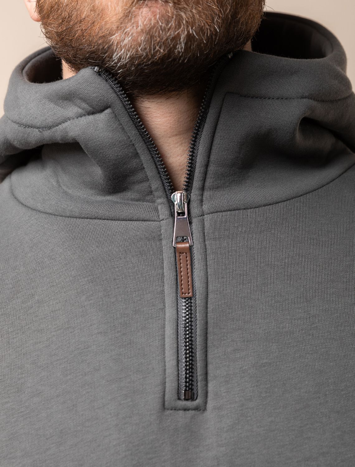 Худи выполнено из премиального футера-трехнитки с начесом. Теплая модель дополнена удобным карманом кенгуру и темно-серебристой молнией на вороте. Благодаря регулировке воротника можно носить изделие по-разному, как джемпер и как худи. Сочетайте в костюме с брюками U44.002