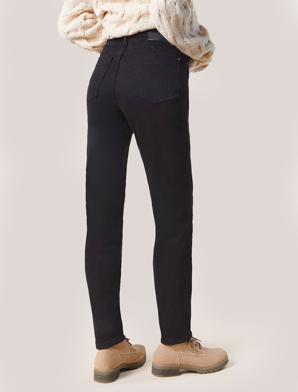 Черные прямые джинсы выполнены из эластичного денима. Внутренняя сторона изделия утепленная мягким флисом обеспечит тепло, комфорт и защиту от холода. Модель стандартной длины с классической посадкой на талии визуально вытягивает силуэт. Лучший вариант для зимнего периода, когда хочется выдержать стиль и практичность.