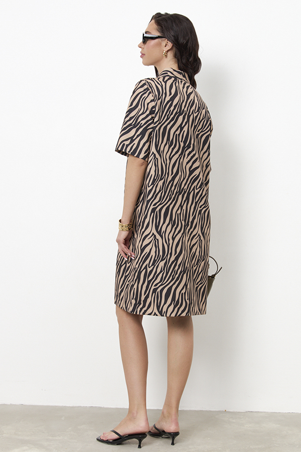 Платье свободного силуэта из плательной ткани. По центру передней части изделия выполнен шов. Цельнокроеная стойка, переходящая в V-образный вырез горловины, визуально делает фигуру стройнее. Втачной короткий рукав.