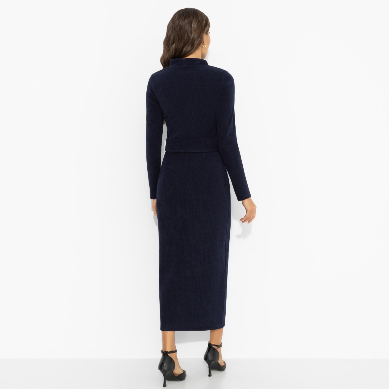 Платье для тех, кто выбирает лучшее без лишних слов. Сдержанная роскошь, спокойная уверенность... и любовь уже откликается на внутреннюю аристократию. Асимметричная верхняя деталь и аккуратный пояс с пуговицами добавляют к строгой эстетике лёгкий намёк на интригу – как будто за идеальной формой скрывается своя маленькая тайна. Конечно, разгадать ее сможет только «тот самый». Платье из плотного, моделирующего фигуру вельвета на трикотажной основе.
