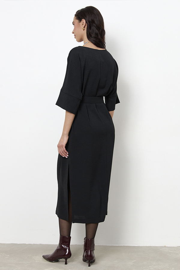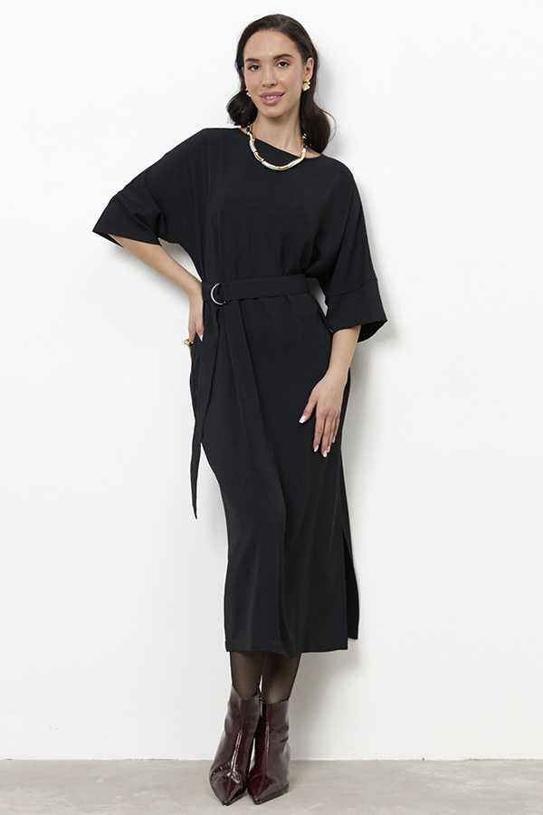 Платье из ткани с крэш-эффектом. Свободный силуэт, с разрезом в боковом шве. Круглый вырез горловины окантован косой бейкой из основной ткани. Цельнокроеный рукав с притачной манжетой. В комплекте пояс из основной ткани. В таблице размеров представлены параметры человека, а не изделия.