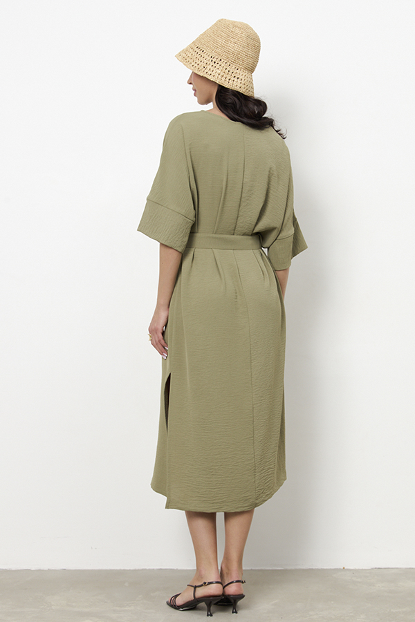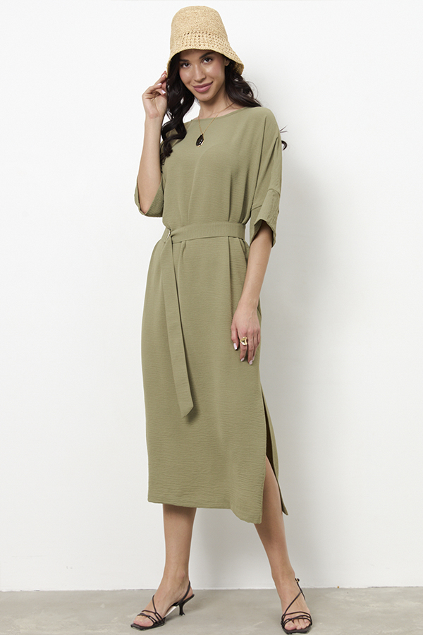 Платье из ткани с крэш-эффектом. Свободный силуэт, с разрезом в боковом шве. Круглый вырез горловины окантован косой бейкой из основной ткани. Цельнокроеный рукав с притачной манжетой. В комплекте пояс из основной ткани. В таблице размеров представлены параметры человека, а не изделия.
